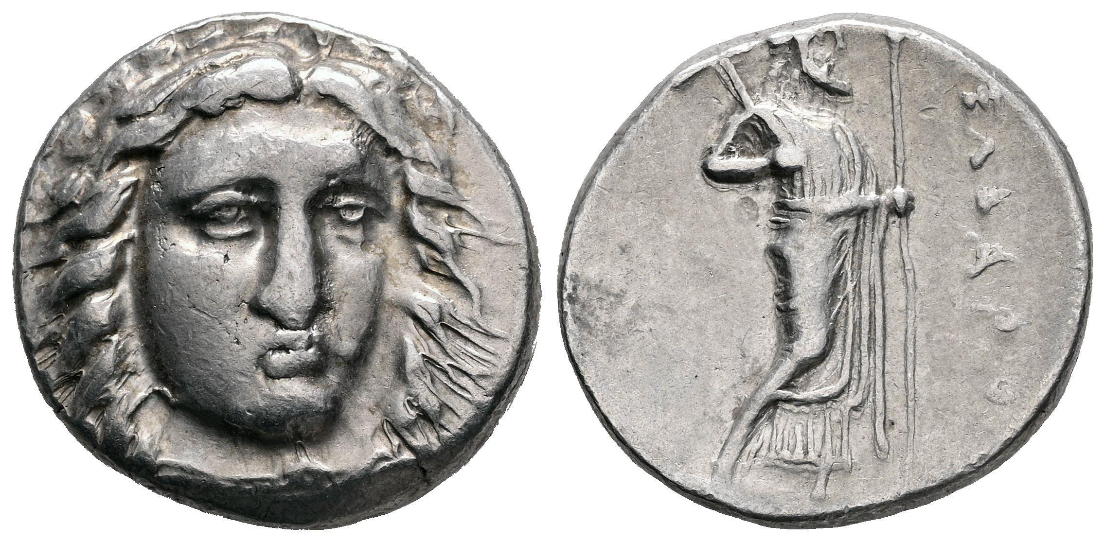 Sátrapas de Caria. Pixodaros. Didracma. 341/0-336/5 a.C. Halikarnassos. (Konuk-Identities 30). (HN Online-241). (Babelon-Perses 414/21). Anv.: Cabeza laureada de Apolo mirando ligeramente hacia la derecha, con un drapeado alrededor del cuello. Rev.: Zeus Labraundos en pie a la derecha, sosteniendo un hacha doble (labrys) sobre el hombro y un cetro con punta de loto; ΠIΞΩΔAPOY a la derecha. Ag. 6,96 g. Ex Classical Numismatic Group 565 (03/07/2024), lote 158. Conserva la etiqueta original. MBC+. Est...250,00.