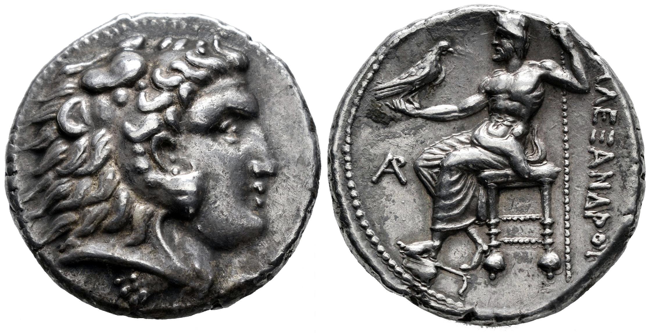 Egipto Ptolemaico. Ptolomeo I Soter, como Sátrapa. Tetradracma. 320/19-311/0 a.C. Arados. En nombre y tipos de Alejandro III de Macedonia. (Price-3426 (Byblos)). (Müller-1375). Anv.: Cabeza de Heracles a la derecha, con tocado de piel de león. Rev.: Zeus Aëtophoros sedente a la izquierda, sosteniendo un cetro; AΛEΞANΔPOY a la derecha, AP (monograma cívico) en el campo izquierdo. Ag. 17,31 g. Suave pátina. Ex Classical Numismatic Group 421 (30/05/2018), lote 396. Conserva la etiqueta original. MBC+/EBC-. Est...1000,00.