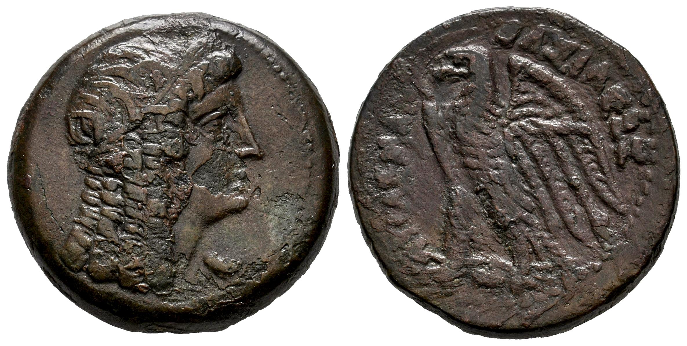 Egipto Ptolemaico. Ptolomeo V Epiphanes. AE 28. 204-180 a.C. Alejandría. (Svoronos-1234). (Sng Cop-247/8). (Faucher & Lorber-Series 6B). Anv.: Cabeza de Isis coronada a la derecha. Rev.: ΠΤΟΛΕΜΑΙΟΥ ΒΑΣΙΛΕΩΣ. Águila con las alas extendidas en pie a la izquierda sobre un rayo. Ae. 17,64 g. Oxidaciones. MBC-/BC+. Est...100,00.