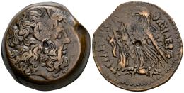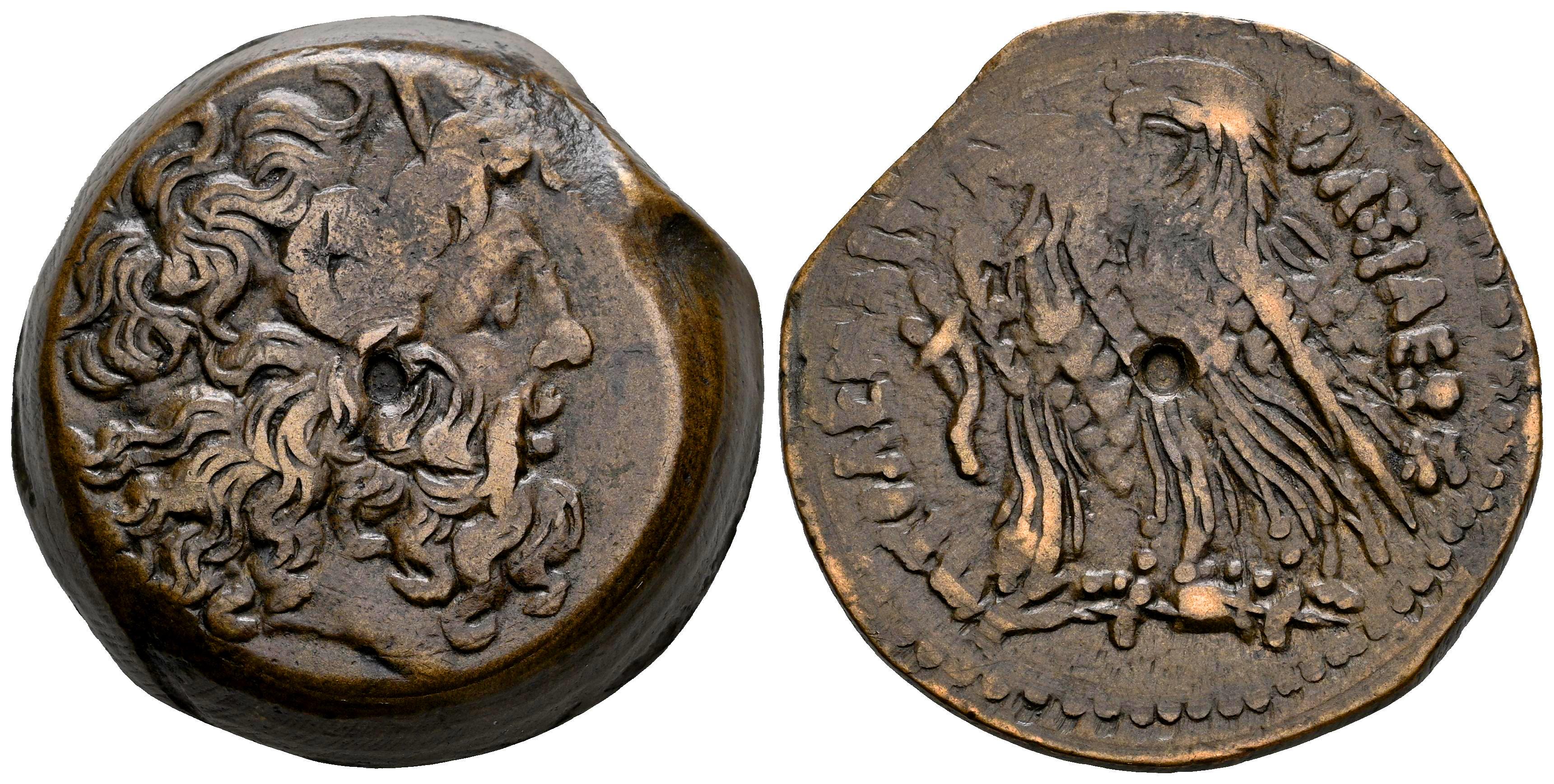 Egipto Ptolemaico. Ptolomeo VI Philometor. Dióbolo. 170-164 a.C. Alejandría. (Gc-7900). (Sng Cop-308). Anv.: Cabeza de Zeus-Amón a la derecha. Rev.: Dos águilas con las alas cerradas en pie a la izquierda sobre un rayo; cornucopia a la izquierda. Ae. 23,94 g. MBC. Est...60,00.