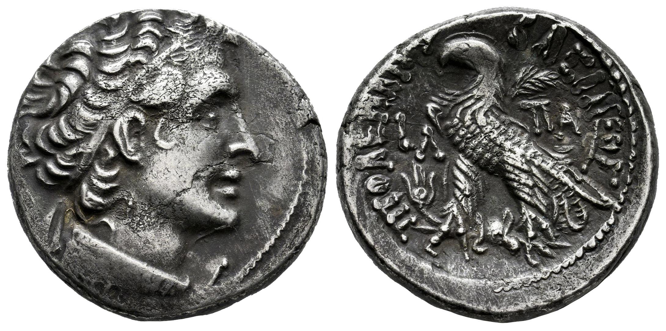 Egipto Ptolemaico. Ptolomeo XII Neos Dionysos (Auletes). Tetradracma. RY 30 = 52/1 a.C. Alejandría. (Svoronos-1840). (Sng Cop-397). (Tesorillo-Egipto 11, mismo ejemplar). Anv.: Cabeza con diadema a la derecha, con aegis. Rev.: ΠΤΟΛΕΜΑΙΟΥ BAΣΙΛΕΩΣ. Águila en pie a la izquierda sobre un rayo, hoja de palma sobre el hombro; L Λ (fecha) sobre tocado de Isis a la izquierda, ΠΑ a la derecha. Ag. 12,47 g. Ex Tesorillo Vol. I, lote 51. MBC+. Est...350,00.