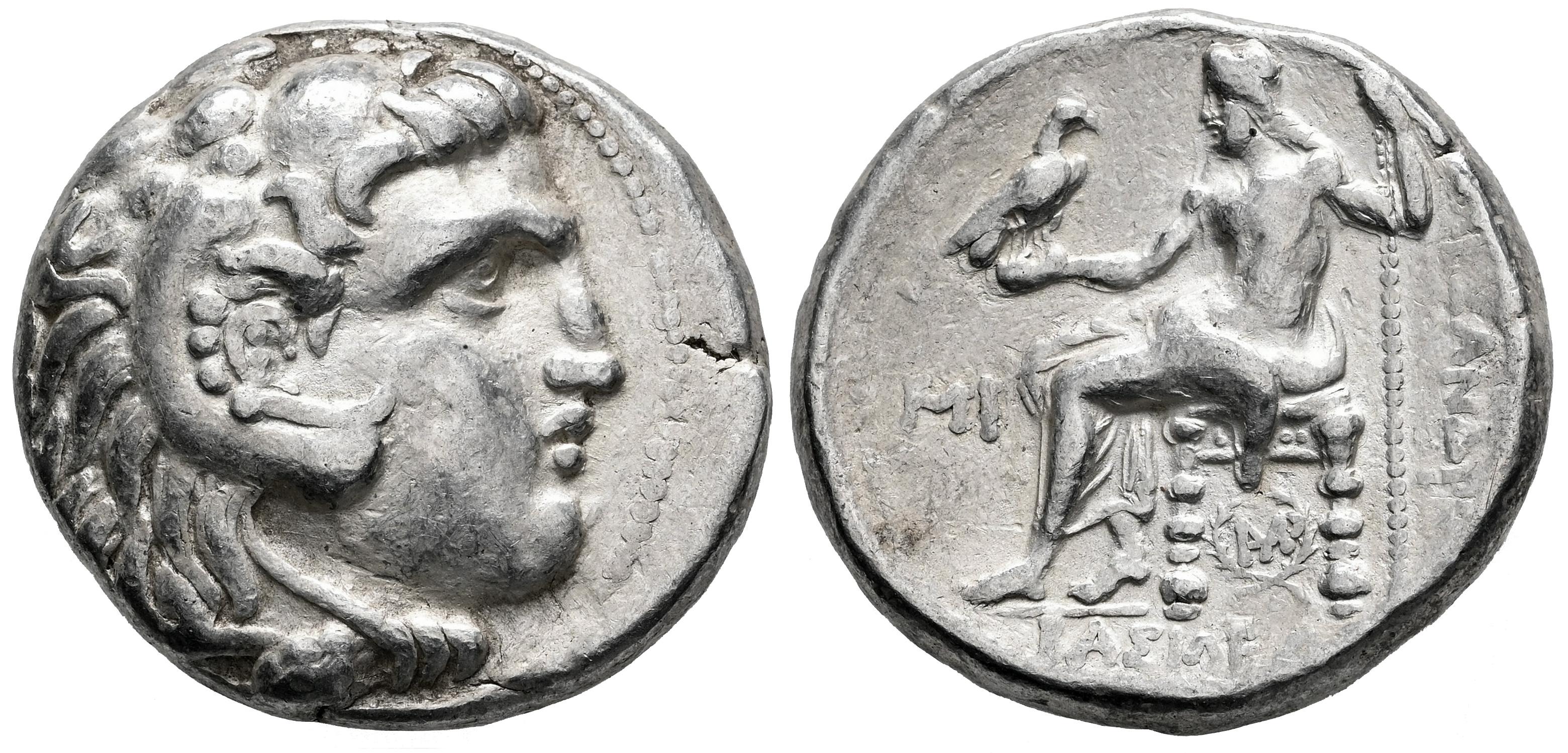 Imperio Seléucida. Seleukos I Nikator. Tetradracma. 311-300 a.C. Babilonia. En nombre y tipos de Alejandro III de Macedonia. (Price-3751). (SC-82.4a). (Müller-735). Anv.: Cabeza de Heracles a la derecha, con tocado de piel de león. Rev.: Zeus Aëtophoros sedente a la izquierda, sosteniendo cetro; BAΣIΛEΩΣ debajo, AΛEΞANΔPOY a la derecha, MI en el campo izquierdo, monograma dentro de una corona debajo del trono. Ag. 17,03 g. Ex Classical Numismatic Group 560 (17/04/2024), lote 191. Conserva la etiqueta original. MBC. Est...220,00.