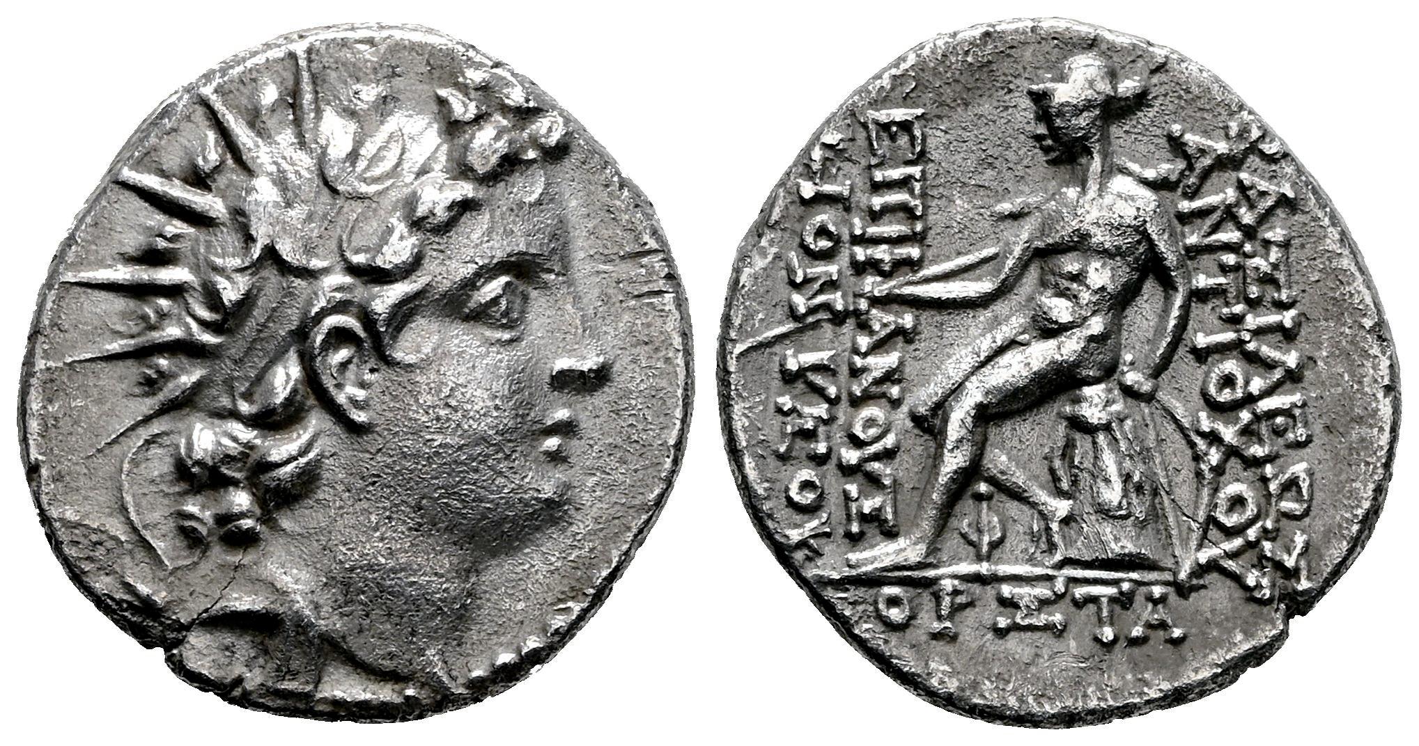 Imperio Seléucida. Antiochos VI Dionysos. Dracma. SE 169 = 144/3 a.C. Antioquía del Orontes. (SC-2002.1e). (Hgc-9, 1036a). (DCA-179). Anv.: Cabeza radiada y diademado a la derecha. Rev.: Apolo Delphios sedente a la izquierda sobre omphalos; BAΣIΛEΩΣ ANTIOXOY a la derecha, EΠIΦANOYΣ ΔIONYΣOY a la izquierda, monograma entre las piernas, ΘΞP (fecha) y ΣTA en el exergo. Ag. 3,74 g. Fina grieta. MBC+. Est...160,00.
