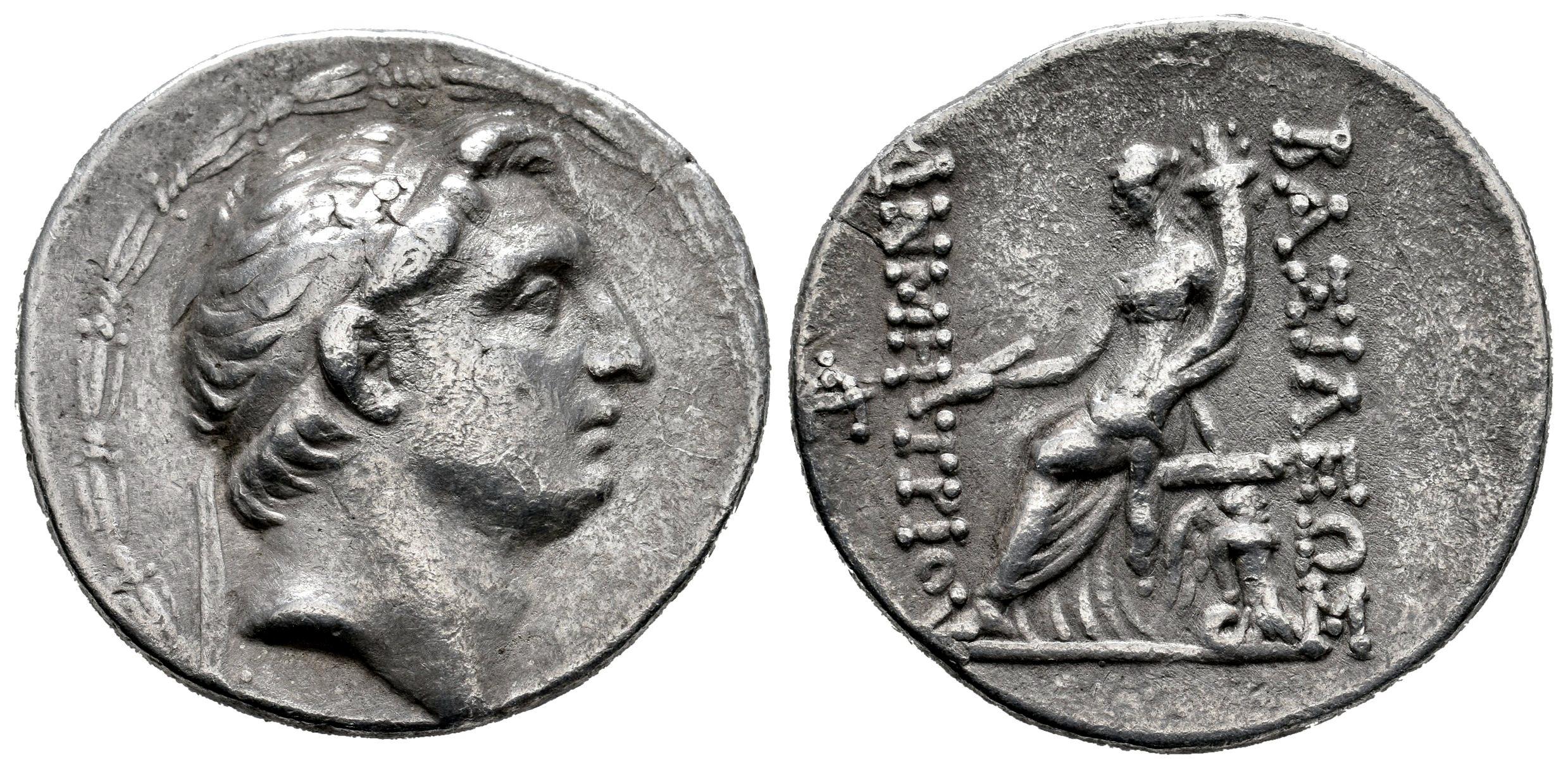 Imperio Seléucida. Demetrios I Soter. Tetradracma. 155-154 a.C. Antioquía del Orontes. (SC-1640). Anv.: Cabeza de Demetrios I a derecha. Rev.: ΒΑΣΙΛΕΩΣ - ΔHMHTPIOΥ. Tyche sentada a izquierda en trono sostenido por tritono a la derecha, sosteniendo cetro en su mano derecha y cornucopiae en la izquierda; a la izquierda, monograma. Ag. 16,49 g. MBC. Est...150,00.