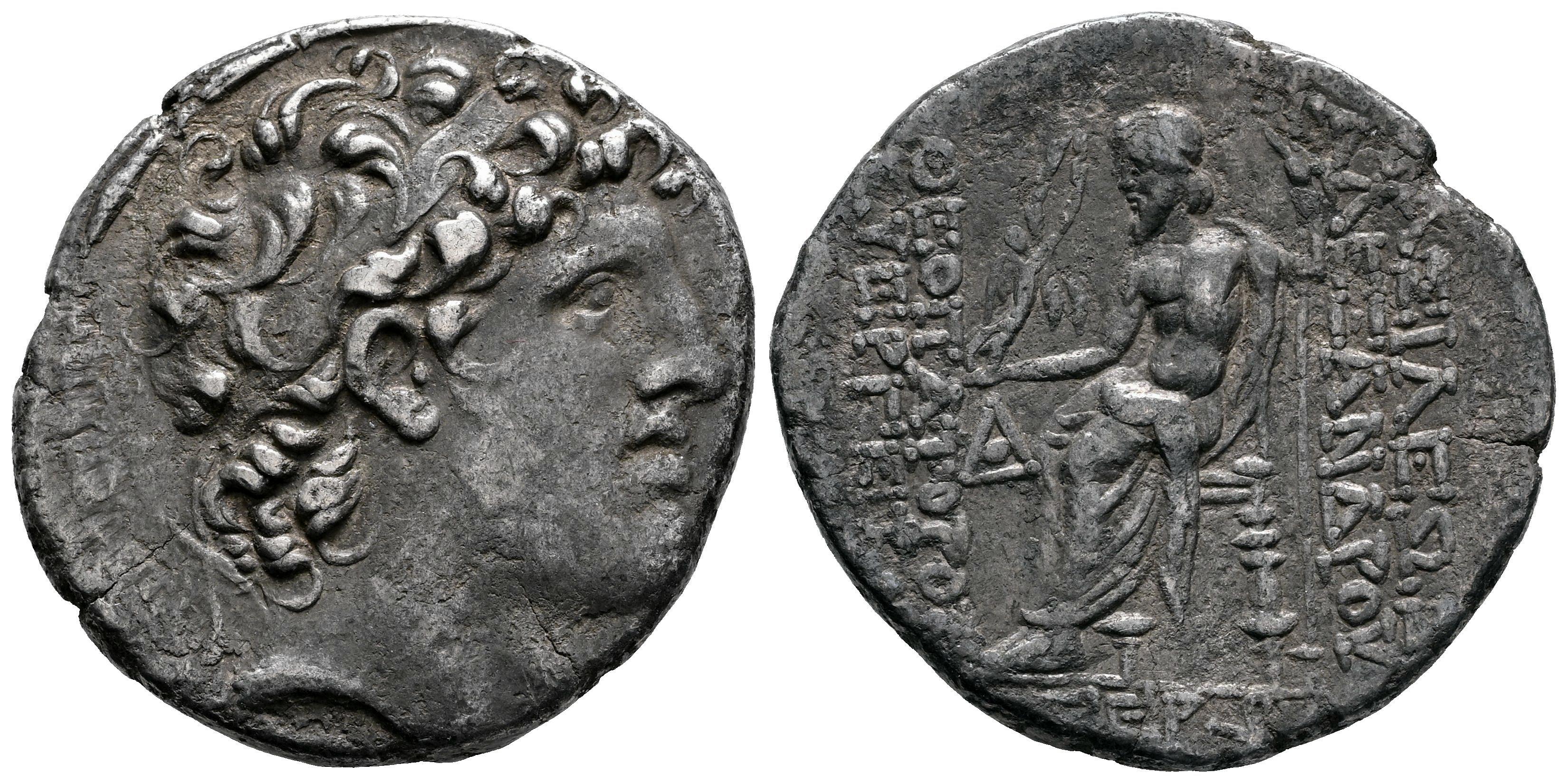 Imperio Seléucida. Alejandro I Balas. Tetradracma. SE 163 = 150/49 a.C. Antioquía del Orontes. (SC-1781.3e). (Hgc-9, 875a). (DCA-2 57). Anv.: Cabeza con diadema a la derecha. Rev.: Zeus Nicéforo sedente a la izquierda, sosteniendo cetro; BAΣIΛEΩΣ AΛEΞANΔPOY a la derecha, ΘEOΠATOPOΣ EYEPΓETOY a la izquierda, monogramas en los campos [exterior izquierdo] e interior izquierdo, ΓΞΡ (fecha) y monograma en el exergo. Ag. 15,42 g. Pátina. Fina grieta. Ex Classical Numismatic Group 561 (01/05/2024), lote 254. Conserva la etiqueta original. MBC-. Est...180,00.