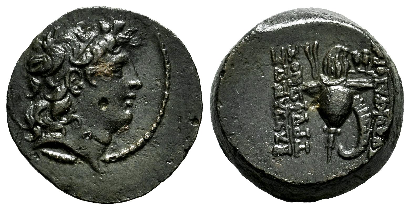 Imperio Seléucida. Tryphon. AE 19. 142-138 a.C. Antioquía del Orontes. (SC-2034.2d). (Hgc-9, 1061). Anv.: Cabeza con diadema a la derecha. Rev.: BAΣIΛEΩΣ TPYΦΩNOΣ AYTOKPATOPOΣ. Casco Macedonio con pincho y protectores de mejillas, adornado con cuerno de cabra salvaje sobre la visera; piloi de los Dioskouroi en el interior izquierdo. Ae. 6,53 g. MBC+. Est...80,00.