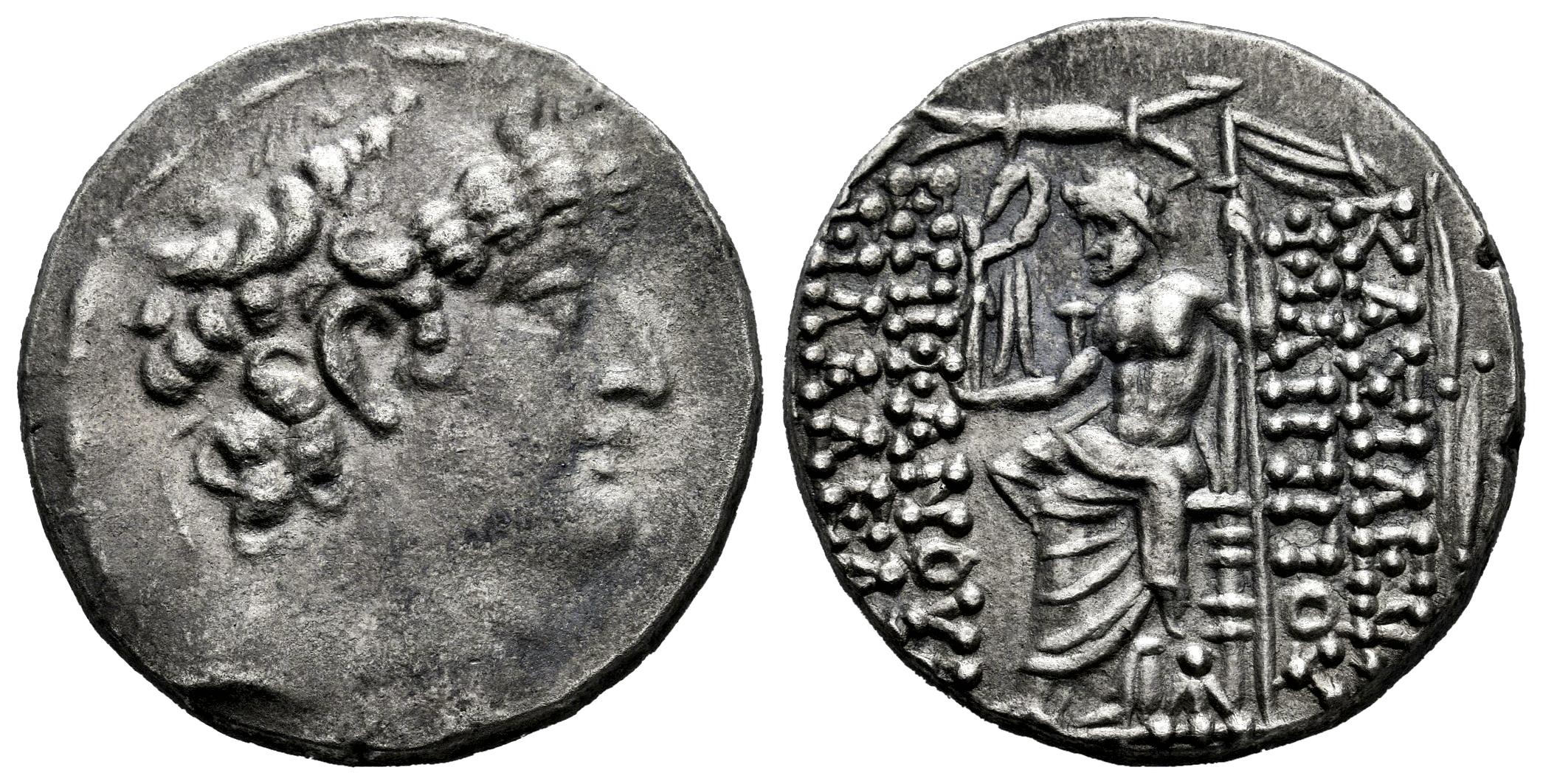 Imperio Seléucida. Filipo I Filadelfos. Tetradracma. 88-75 a.C. Antioquía del Orontes. (SC-2463.1). (Hgc-9, 1319). Anv.: Cabeza diademada a derecha. Rev.: Zeus Nicéforo sedente sobre trono a izquierda, sosteniendo cetro; ΒΑΣΙΛΕΩΣ ΦΙΛΙΠΠΟY a la derecha, ΕΠΙΦΑΝΟYΣ ΦΙΛΑΔΕΛΦΟY a la izquierda, (N encima de A) en el campo exterior izquierdo, monograma debajo del trono. Ag. 15,26 g. Ligero tono. MBC. Est...180,00.