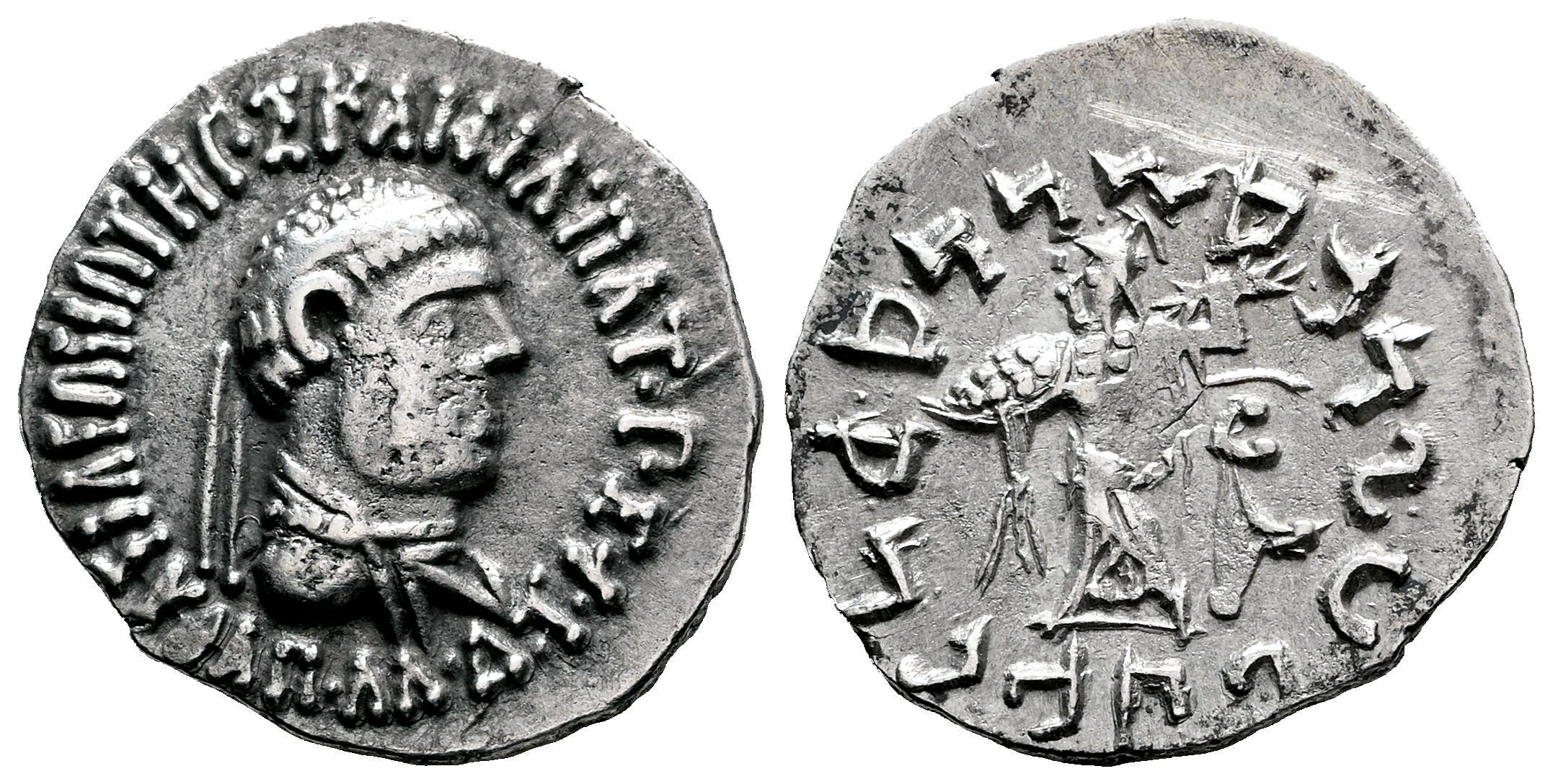 Reino de Indogrecia. Apollodotos II. Dracma. 85-65 d.C. (Bopearachchi-2A). (Mitchiner-424d). (Hgc-12,392). Anv.: BAΣIΛEΩΣ ΣΩTPOΣ KAI ΦIΛOΠATPOΣ AΠOΛΛOΔOTOY. Busto con diadema y drapeado a la derecha. Rev.: 'Maharajasa tratarasa Apaladatasa' en Kharosthi, Atenea Alkidemos avanzando hacia la izquierda, escudo decorado conaegis sobre el brazo, lanzando un rayo; monograma a la derecha. Ag. 2,16 g. MBC+. Est...90,00.