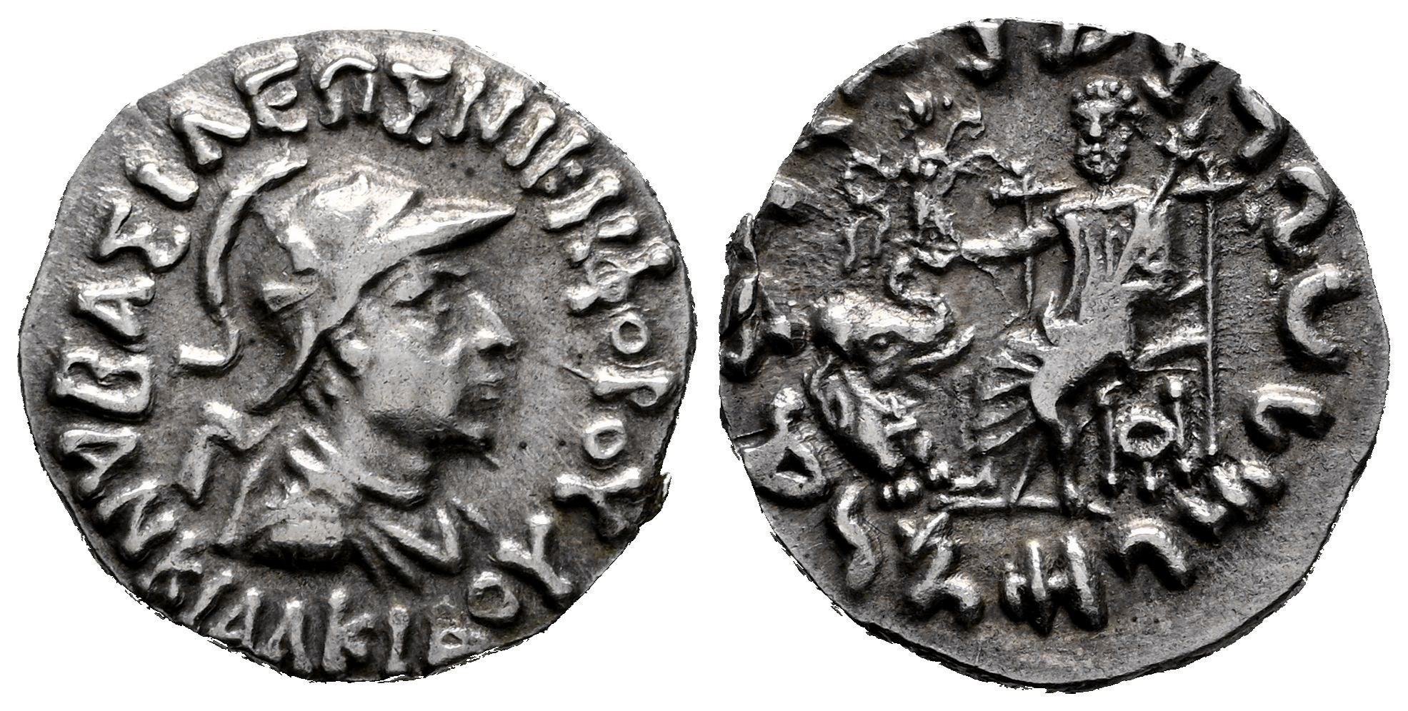 Reino de Indogrecia. Antialkidas Nikephoros. Dracma. 130-120 a.C. (Bopearachchi-12B). (Hgc-12, 258). Anv.: ΒΑΣΙΛΕΩΣ ΝΙΚΗΦΟΡΟΥ ΑΝΤΙΑΛΚΙΔΟΥ. Busto con diadema y drapeado a la derecha, con casco con cresta adornado con cuerno y oreja de toro. Rev.: Zeus Nikephoros sedente mirando ligeramente hacia la izquierda; parte delantera de elefante a la izquierda, con la trompa levantada, monograma debajo del trono. Ag. 2,54 g. Ex Leu Numismatik 6 (09/12/2018), lote 424. Maggiore Collection (1970/2000). MBC+/EBC-. Est...150,00.