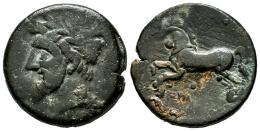 Reyes de Numidia. Massinissa o Micipsa. AE 26. 203-148 o 148-118 a.C. (Mazard-50). (Sng Cop-505). (MAA-18a). Anv.: Cabeza laureada y barbada a la izquierda. Rev.: Caballo galopando a la izquierda; punto debajo. Ae. 13,85 g. Oxidaciones en reverso. MBC-. Est...60,00.