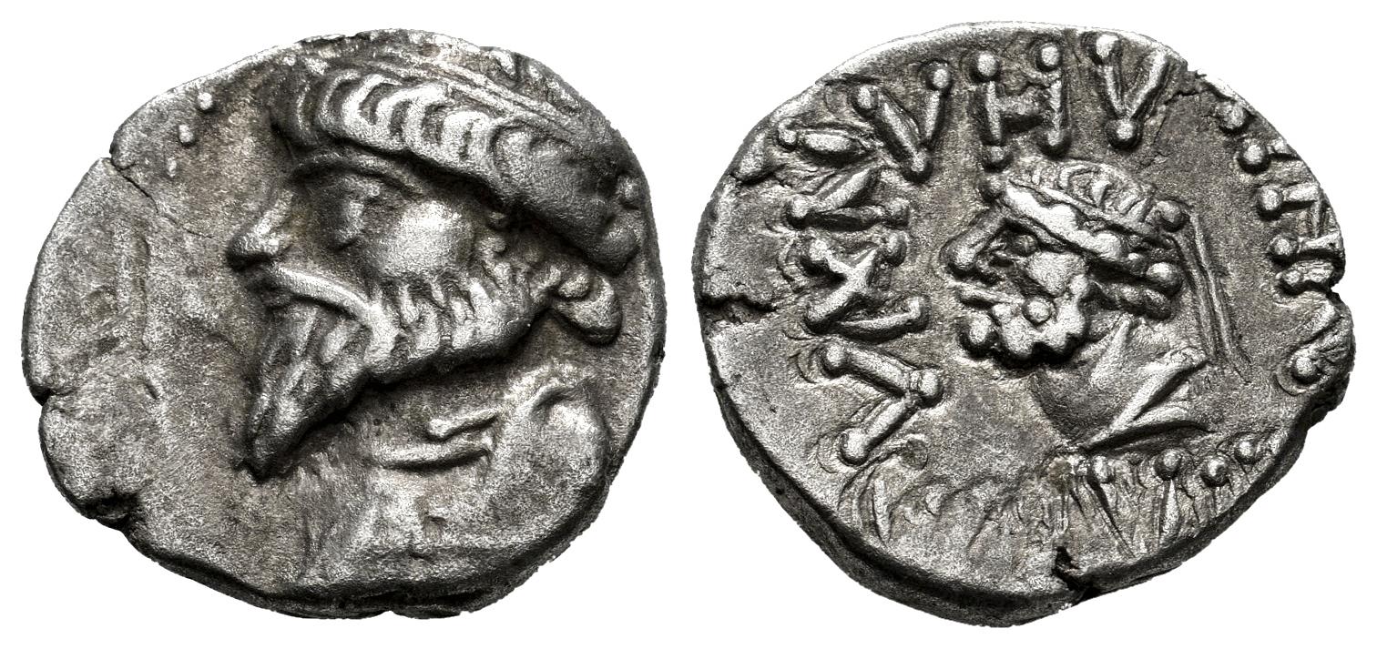 Reyes de Elymais. Kamnaskires V. Dracma. 54/3-33/2 a.C. Seleukeia en el Hedyphon. (Van't Haaff-Type 9.1, Subtype 2-5). Anv.: Busto diademado y drapeado de Kamnaskires V a la izquierda; detrás, (estrella sobre el ancla). Rev.: Leyenda degenerada: LΒΑΣΙΛΕΩΣ ΚΑΜΝΑΣΚΙΡΟΥ ΤΟΥ ΕΓ ΒΑΣΙΛΕΩΣ ΚΑΜΝΑΣΚΙΡΟΥ. Busto diademado de Kamnaskires IV a la izquierda. Ag. 3,86 g. Escasa. MBC+. Est...120,00.