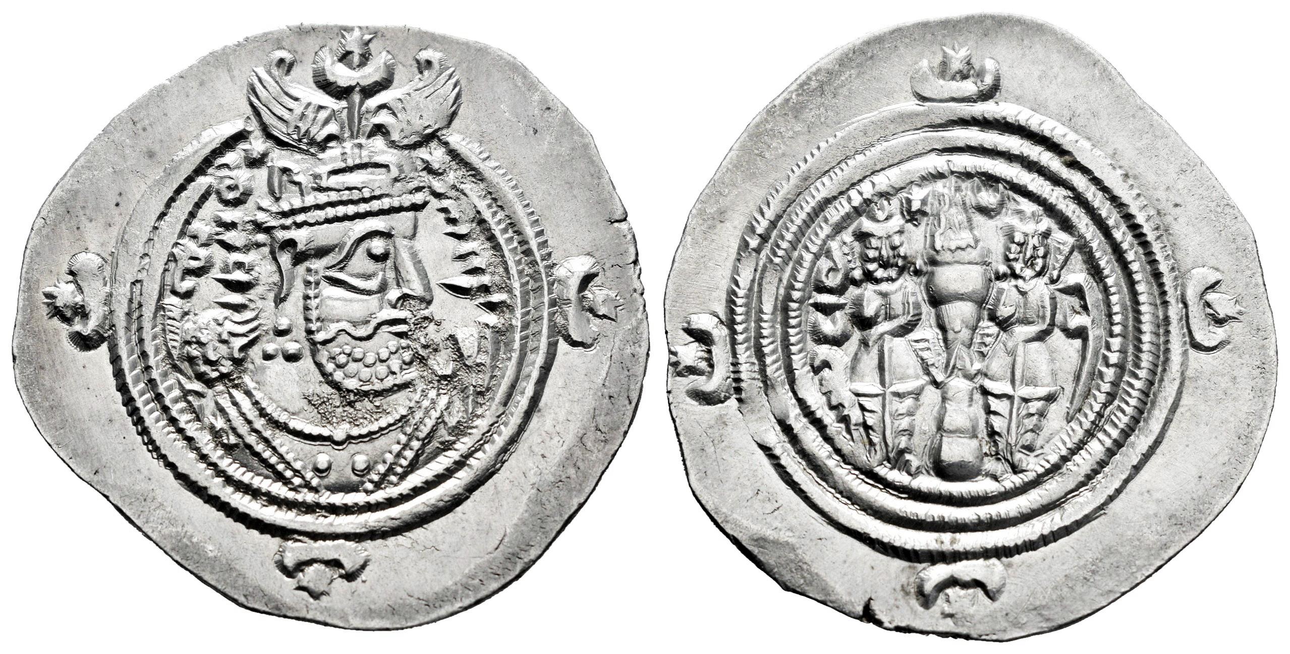 Imperio Sasánida. Khusro II. Dracma. RY 35 = 624/5 d.C. YZ (Yazd). (Göbl-II/3). Anv.: Busto drapeado de Cosroes II a la derecha, con una elaborada corona mural; detrás de la cabeza, AFZUT GDH ('que su reinado vaya en aumento' en pahlawi); delante de la cabeza, HWSRWD ('Cosroes' en pahlawi). Rev.: Altar del fuego con cintas, flanqueado por dos asistentes; en el campo superior izquierdo, una estrella de seis puntas; en el campo superior derecho, una media luna; a la izquierda, la fecha; a la derecha, YZ (nombre de la Casa de la Moneda en pahlawi). Ag. 4,18 g. Buen ejemplar. EBC. Est...90,00.