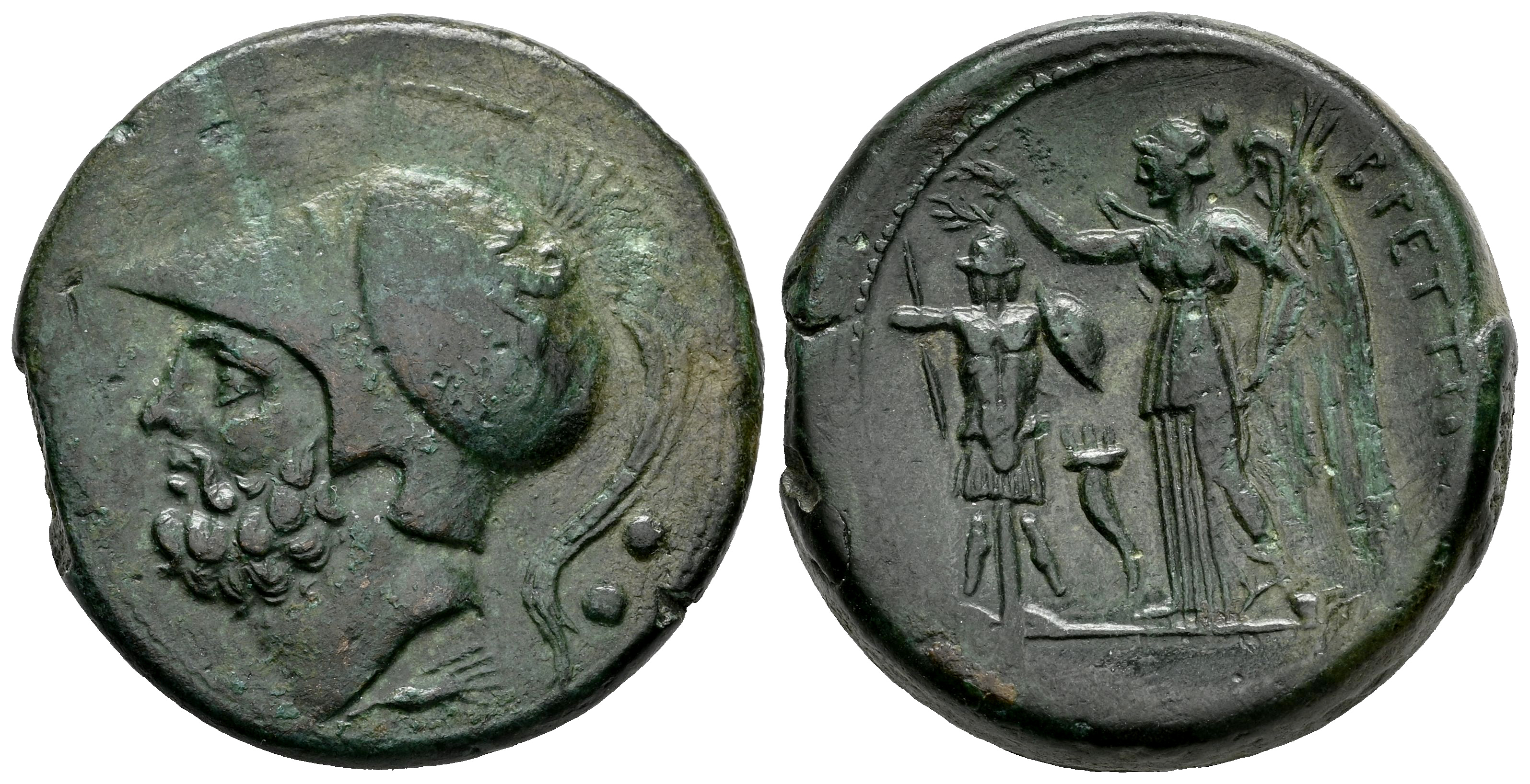 Bruttium. Brettii. Didracma. 214-211 a.C. (HN Italy-1975). (Sng Ans-30/3). (Hgc-1, 1361). Anv.: Cabeza de Ares a la izquierda, con casco corintio con cresta decorado con grifo; espiga de trigo debajo, dos puntos detrás. Rev.: Niké en pie a la izquierda, colocando una corona sobre un trofeo a la izquierda y acunando una palma en su brazo izquierdo; cornucopia entre medio, BPETTIΩN hacia abajo a la derecha. Ae. 17,79 g. Bonita pátina verde. MBC+. Est...200,00.