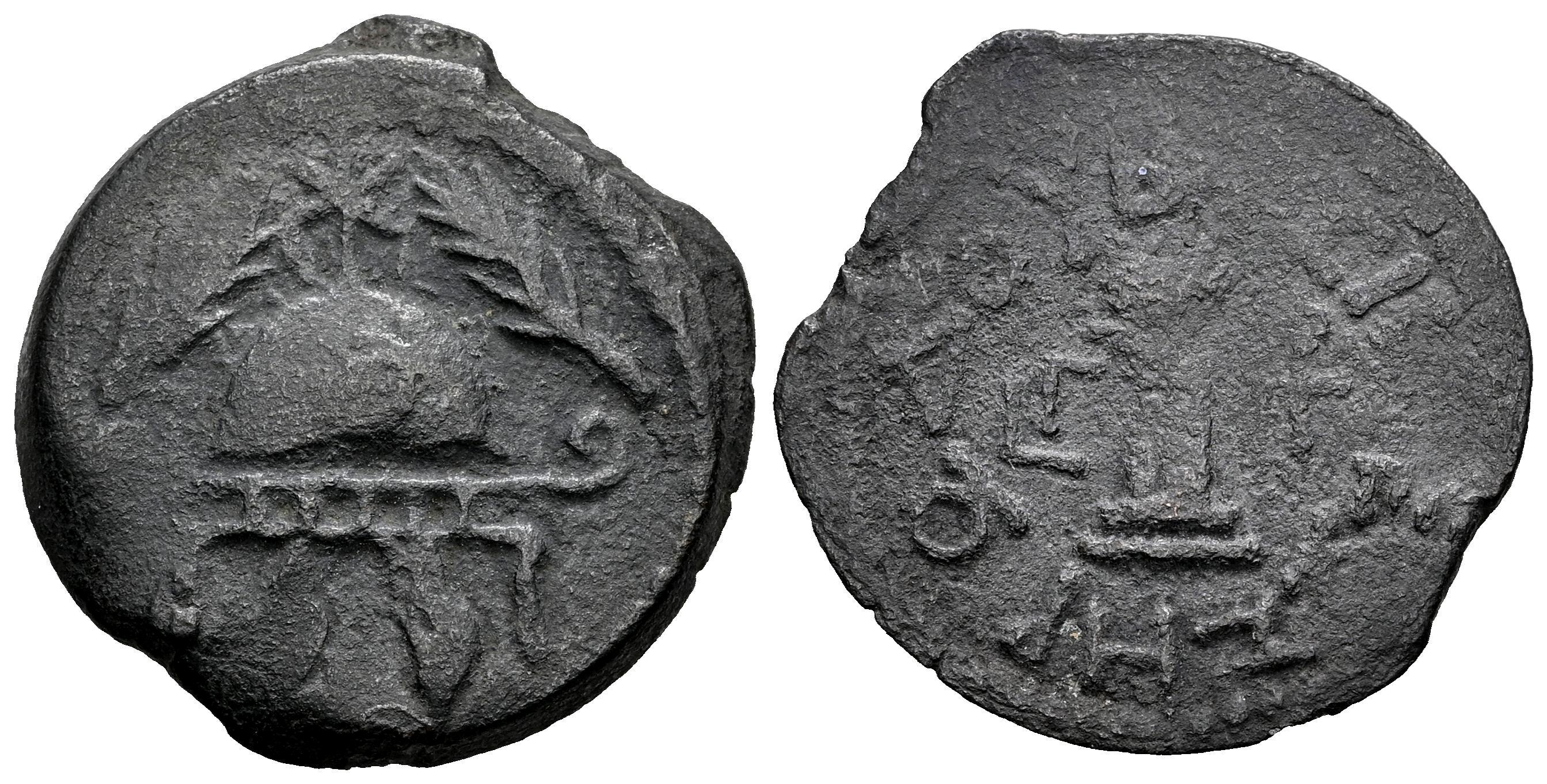 Judaea. Hasmoneos. Herodes I (El grande). 8 Prutot. RY 3 = 40 BCE. Samaria (¿Sebaste?). (TJC-44). (Hendin-GBC 5, 1169). (RPC-I 4901). Anv.: Casco ornamentado con cresta alta rematada por una estrella; flanqueado por ramas de palma. Rev.: Trípode; BAΣIΛEΩΣ HPOΔOY alrededor, LΓ (fecha) a la izquierda, monograma a la derecha; todo dentro de una corona. Ae. 5,39 g. MBC. Est...180,00.