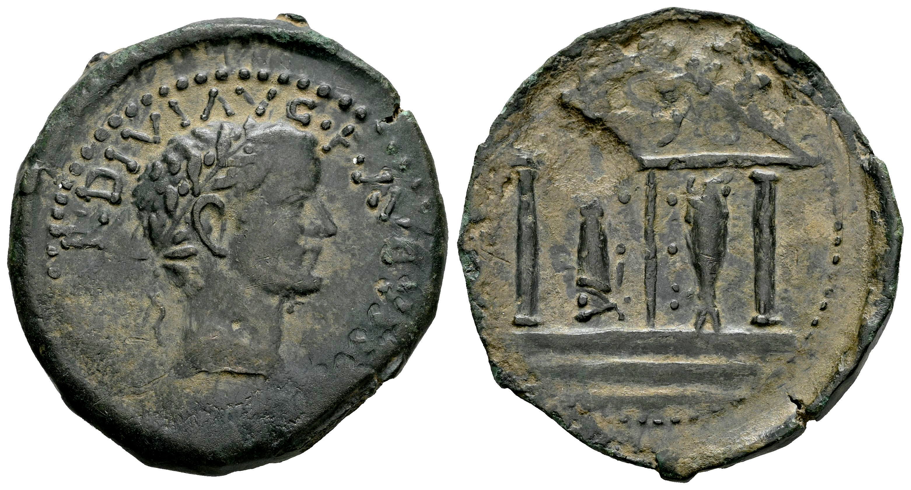 Abdera. Época de Tiberio. As. 14-36 d.C. Adra (Almería). (Abh-24). (Acip-3303). Anv.: Cabeza laureada de Tiberio a derecha, leyenda (TI. CAESA)R. DIVI. AVG. F. AVGVS(TVS). Rev.: Templo tetrástilo, en el tímpano estrella. Ae. 8,48 g. Leve defecto de acuñación. Muy escasa. MBC+. Est...250,00.