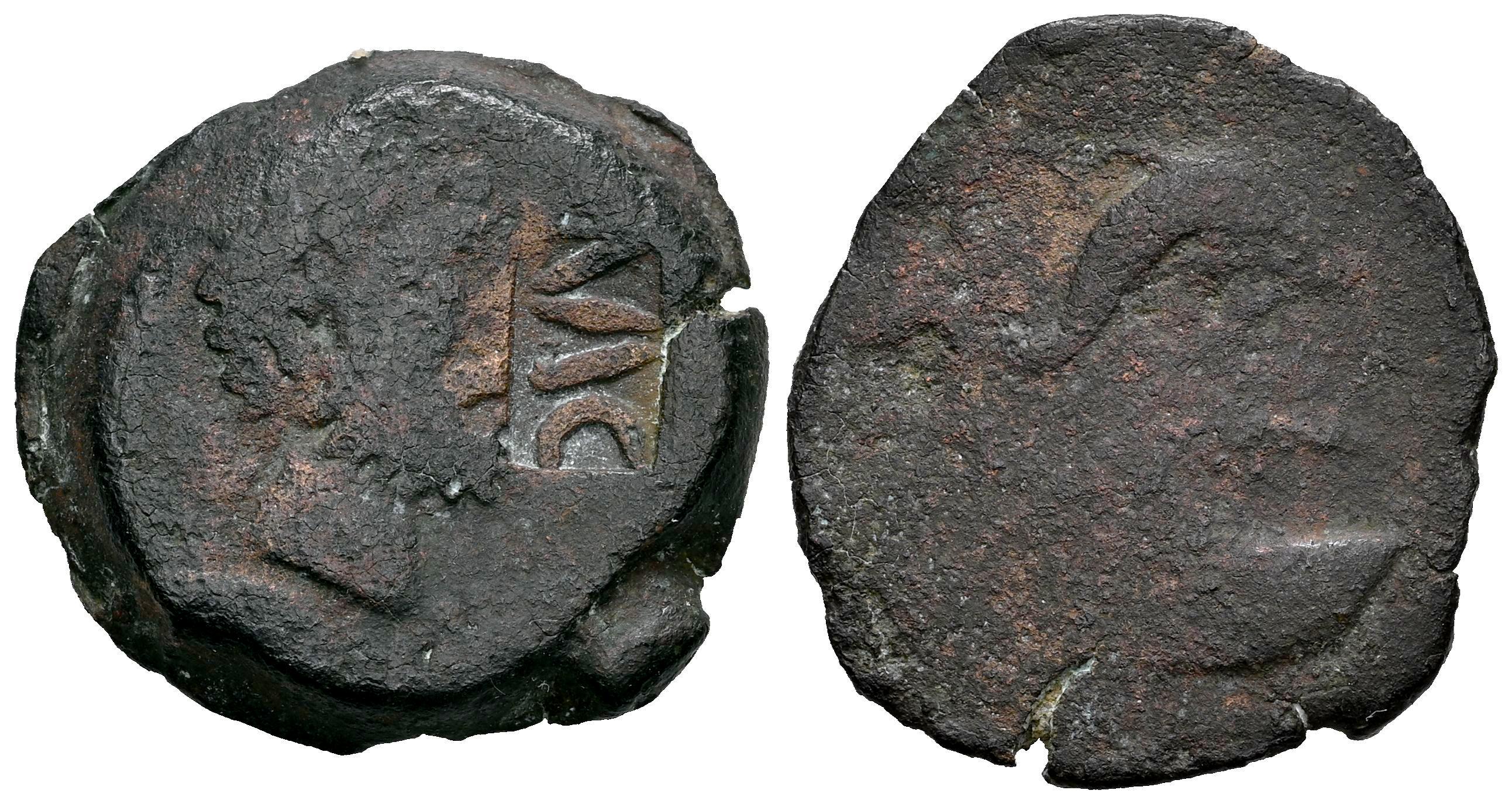 Albatha. Semis. 140-90 a.C. Abla (Almería). (Abh-No cita). (MIB-15122. 13/2). Anv.: Cabeza masculina con barba a la derecha, detrás clava. Rev.: Delfín y atún a la derecha, entre ambos palma a la izquierda, debajo del delfín leyenda púnica l'lbt'. Ae. 7,43 g. Contramarca VIC dentro de un punzón rectangular en su anverso. Rarísima. BC+/BC. Est...200,00.