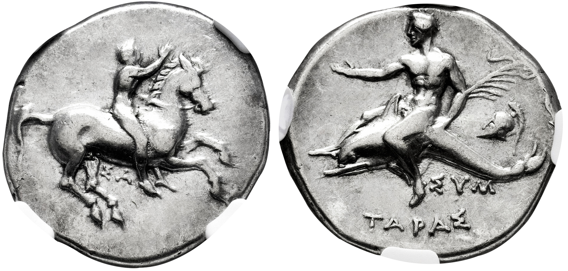 Calabria. Tarentum. Nomos. 315-300 a.C. Magistrados Sa- y Sym-. (Vlasto-651). (HN Italy-941). Anv.: Joven desnudo a caballo a la derecha, levantando su mano derecha para coronar la cabeza del caballo; ΣA debajo. Rev.: Taras a horcajadas sobre un delfín a la izquierda, su brazo derecho extendido y sosteniendo una larga hoja de palma en su mano izquierda; TAPAΣ debajo, casco corintio con cresta a la izquierda, ΣYM debajo del delfín. Ag. Encapsulada por NGC como Ch VF. Est...250,00.