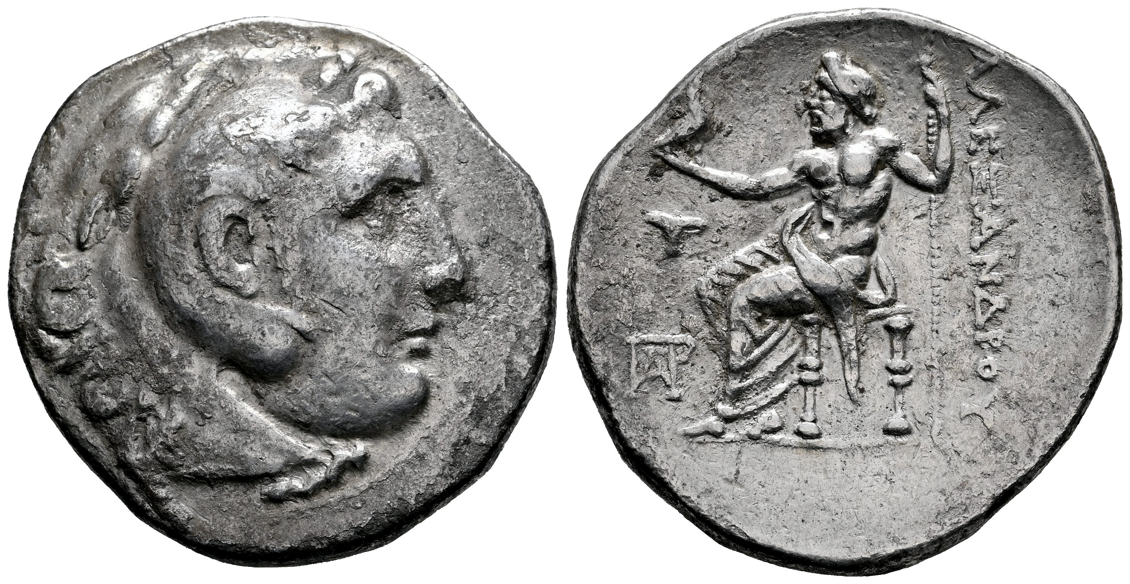 Aeolis. Kyme. Tetradracma. 215-200 a.C. En nombre y tipos de Alejandro III de Macedonia. (Mektipini-254 var. monogram). Anv.: Cabeza de Hércules a la derecha, con tocado de piel de león. Rev.: Zeus Aëtophoros sedente a la izquierda, sosteniendo cetro; AΛEΞANΔPOY a la derecha, jarra con un solo asa sobre un monograma en el campo izquierdo. Ag. 16,51 g. Ex Classical Numismatic Group 565 (03/07/2024), lote 96; Ex Colección Richard Ashton; Classical Numismatic Group 391 (15/02/2017), lote 213. Conserva la etiqueta original. MBC. Est...200,00.