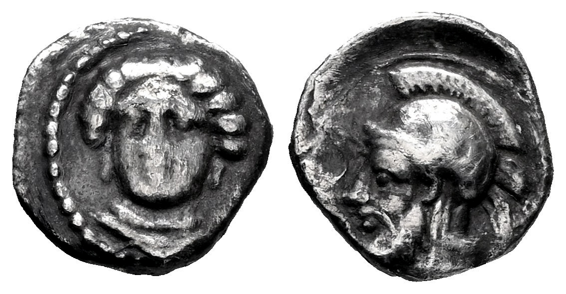Cilicia. Tarsos. Óbolo. 380-360 a.C. Tiempos de los sátrapas Pharnabazos y Datames. (Sng Levante-93). (Sng Bnf-303). Anv.: Cabeza femenina (¿Arethusa?) orientada ligeramente hacia la izquierda. Rev.: Cabeza masculina con casco y barba (¿Ares?) orientada hacia la izquierda. Ag. 0,73 g. MBC. Est...80,00.