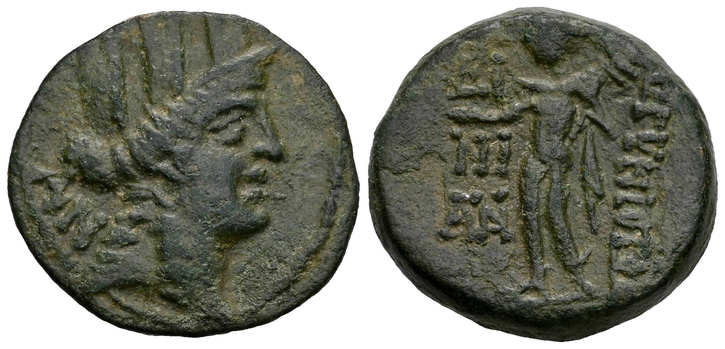 Cilicia. Korykos. AE 21. Siglo I a.C. (Sng France-1086/93). (Sng Levante-791). Anv.: Cabeza de Tyche con corona mural a la derecha; AN a la izquierda. Rev.: KΩPVKIΩΤΩΝ. Hermes en pie a la izquierda, sosteniendo una bolsa y kerykeion; ΔI / NI / AN en el campo izquierdo. Ae. 6,54 g. MBC/MBC+. Est...50,00.