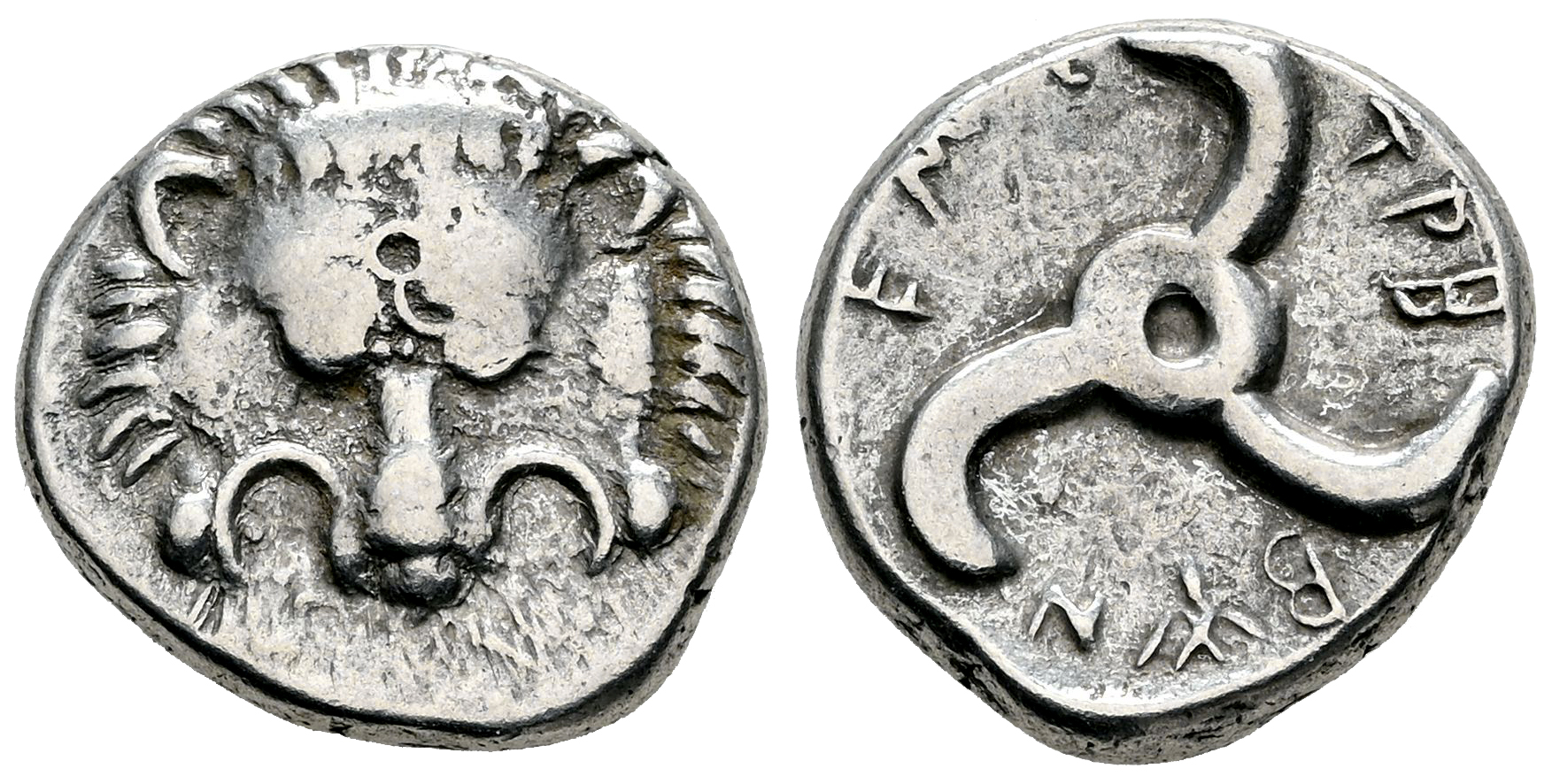 Dinastías de Lycia. Trbbenimi. 1/3 estátera. 390-375 a.C. Wedrei. (Müseler-VIII 25/27). (SNG von Aulock-4215). (Podalia-158/70). Anv.: Piel de león de frente. Rev.: Triskeles; TPBBΨNEME (en licio) alrededor; todo dentro de un círculo incuso poco profundo. Ag. 2,65 g. MBC/MBC+. Est...100,00.