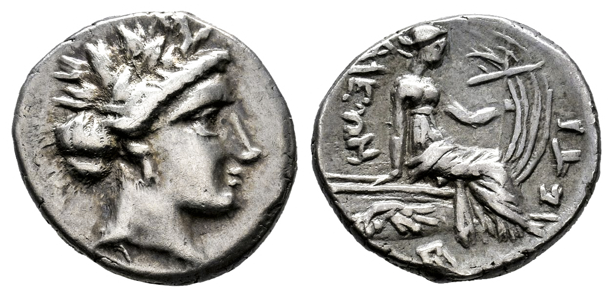 Euboia. Histiaia. Tetróbolo. Siglos III-II a.C. (Hgc-4, 1524). Anv.: Cabeza femenina a la derecha, con corona de hiedra. Rev.: La ninfa Histiaia sedente a la derecha sobre la popa de una galera, sosteniendo un trofeo; ala en la galera, monograma debajo, IΣTIAIEΩN alrededor. Ag. 2,30 g. MBC/MBC+. Est...100,00.