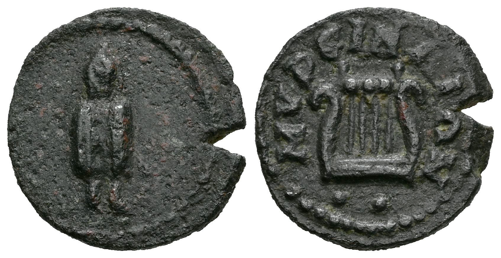 Aeolis. Myrina. AE 14. Siglo III a.C. (Bmc-17,138,39). Anv.: Telesphoros. Rev.: MYPEI NAIΩN. Kythara, •• debajo. Ae. 1,68 g. Rara. Ex Heidelberger Münzhandlung 64 (20/11/2014), lote 830; Ex Gorny & Mosch 130 (08/03/2004), lote 1847. MBC+. Est...180,00.