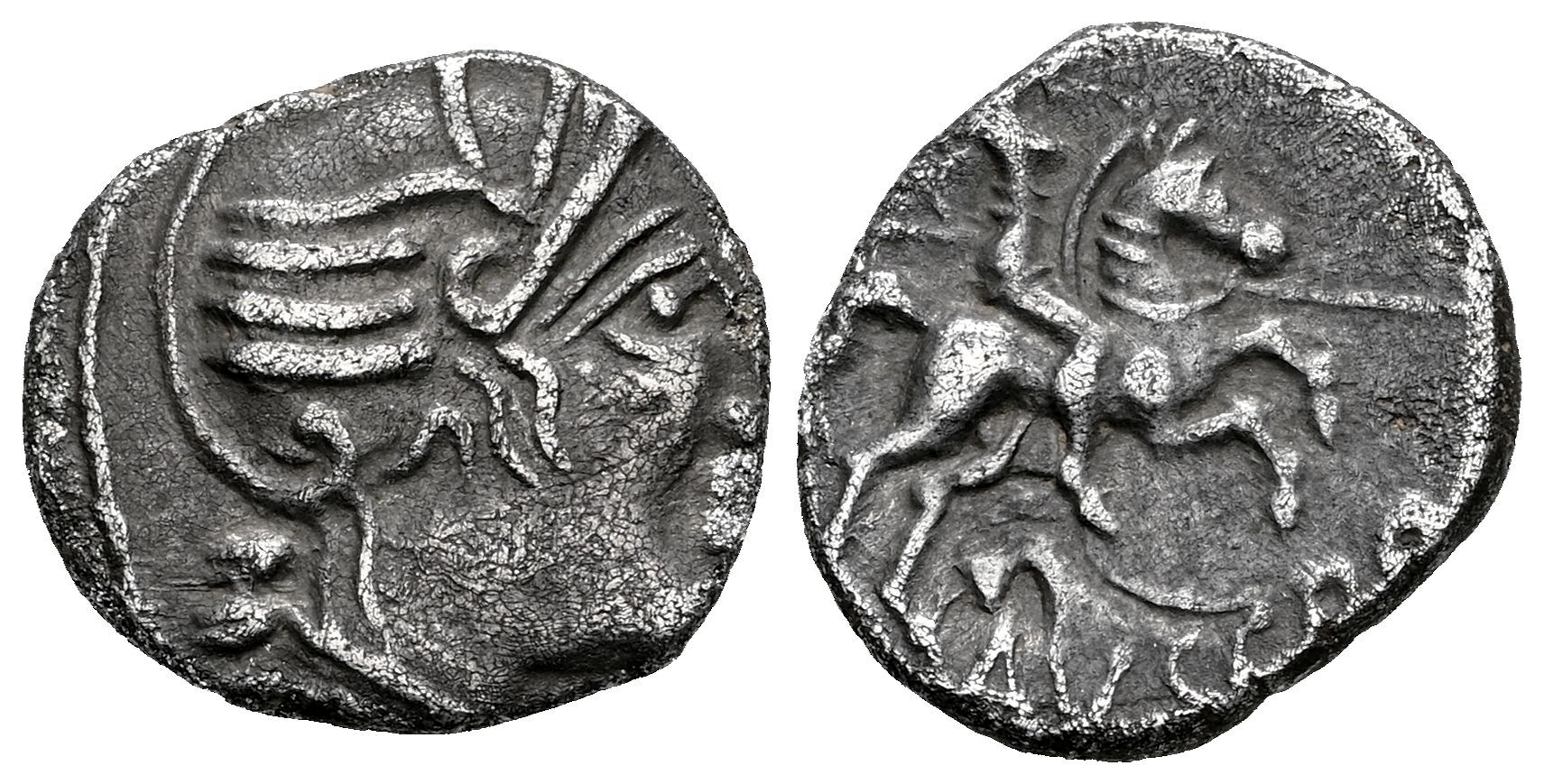 Galia. Quinario. 60-40 a.C. Alobroges. (DT-3161). Anv.: (DVRNACOS), cabeza de Atenea a la derecha, con casco alado. Rev.: Guerrero a caballo al galope a la derecha, lanza apoyada en la mano derecha, debajo AVSCRO. Ag. 1,83 g. MBC+. Est...90,00.