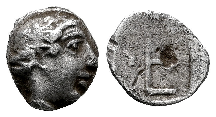 Ionia. Kolophon. Tetartemorión. 450-410 a.C. (SNG Kayhan-358/361). Anv.: Cabeza laureada de Apolo a la derecha. Rev.: Monograma TE; símbolo incierto (¿astráganlo?) en el campo izquierdo; todo dentro de un cuadrado incuso . Ag. 0,32 g. MBC/MBC-. Est...50,00.