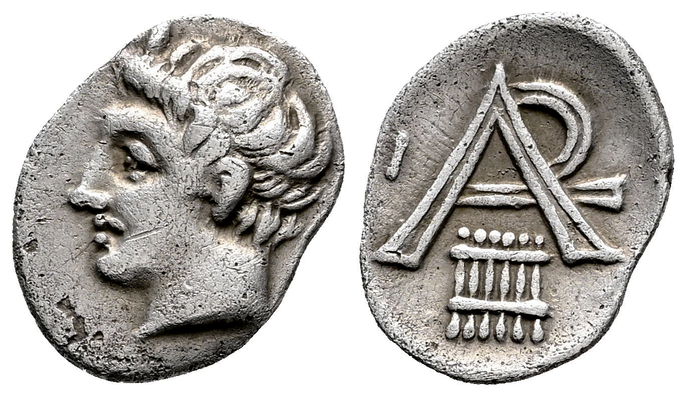 Arkadia. Óbolo. 330-275 a.C. Megalopolis. (Bcd-Peloponnesos 1525). (Hgc-5, 930). Anv.: Cabeza con cuernos de Pan a la izquierda; I a la derecha. Rev.: Monograma de la Liga sobre la siringa o flauta de Pan; I a la izquierda. Ag. 0,84 g. Ex Künker 16 (27/03/2013), lote 39; Ex Gerhard Hirsch 255 (14/02/2008), lote 1504. MBC+. Est...140,00.