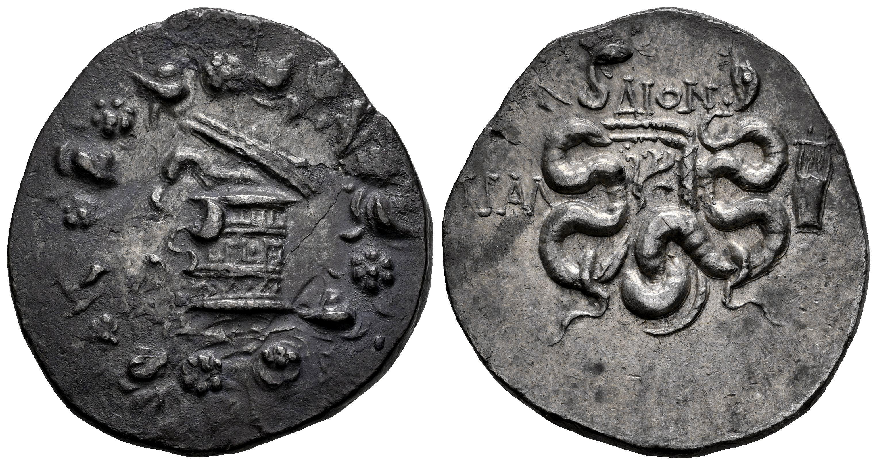 Lidia. Tralleis. Cistóforo. 100-90 a.C. Magistrado Dion... (Sng Cop-657). (SNG von Aulock-3259). Anv.: Cesta (cista mystica) en la que se enrosca una serpiente; alrededor, una corona de hiedra con frutos. Rev.: Dos serpientes enroscadas alrededor del estuche de arco; arriba, ΔΙΟΝ; a la izquierda, TPAΛ; a la derecha, kythara.. Ag. 12,23 g. Reverso con una magnífica acuñación. Pátina con brillo original subyacente. Ex Nomos 11 (08/12/2018), lote 297. MBC+/EBC. Est...190,00.