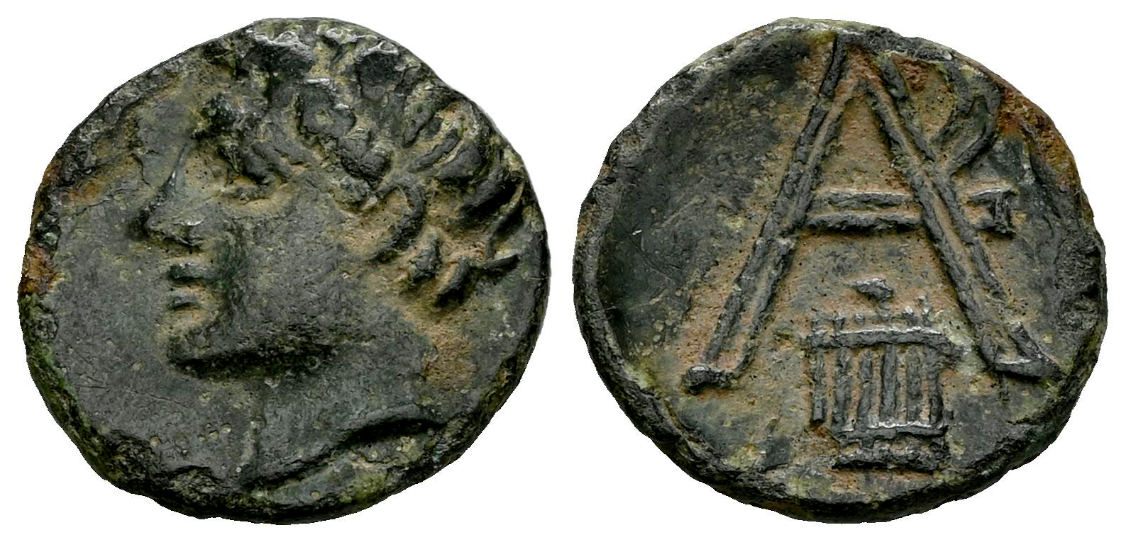 Arkadia. Calco. 300-275 a.C. Megalopolis. (Bcd-Peloponnesos 1538). Anv.: Cabeza de Pan a la izquierda. Rev.: Monograma de la Liga  AR sobre la siringa o flauta de Pan. Ae. 1,27 g. Muy rara. Ex Classical Numismatic Group 81, Colección BCD (20/05/2009), lote 2619. MBC. Est...140,00.