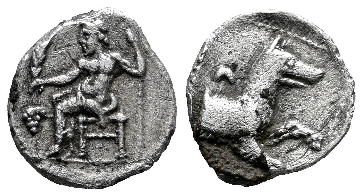 Lykaonia. Laranda. Óbolo. 324/3 a.C. (SNG BnF-443 Cilicia). (Sng Levante-223). (Sng Ashmolean-1923 Cilicia). Anv.: Baaltars sedente a la izquierda, torso hacia adelante, sosteniendo una espiga y un racimo de uvas en la mano derecha extendida, cetro en la izquierda. Rev.: Parte delantera del lobo a la derecha, creciente invertida encima. Ag. 0,57 g. MBC+/MBC. Est...60,00.