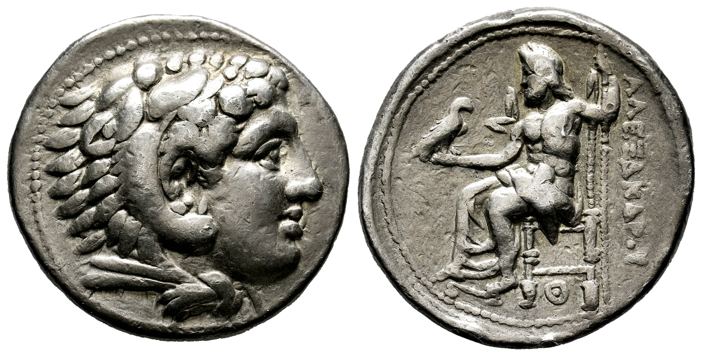 Reino de Macedonia. Filipo III Arrhidaios. Tetradracma. 323-217 a.C. Pella. Acuñada bajo Antípatro o Poliperconte, en nombre y tipo de Alejandro III. (Price-214). (Müller-197). (Sng Cop-710). Anv.: Cabeza de Heracles a la derecha, con tocado de piel de león. Rev.: Zeus Aëtophoros sedente a la izquierda, sosteniendo un cetro; AΛEΞANΔPOY a la derecha, Θ debajo del trono. Ag. 17,02 g. Golpecitos en el canto. MBC/MBC-. Est...300,00.