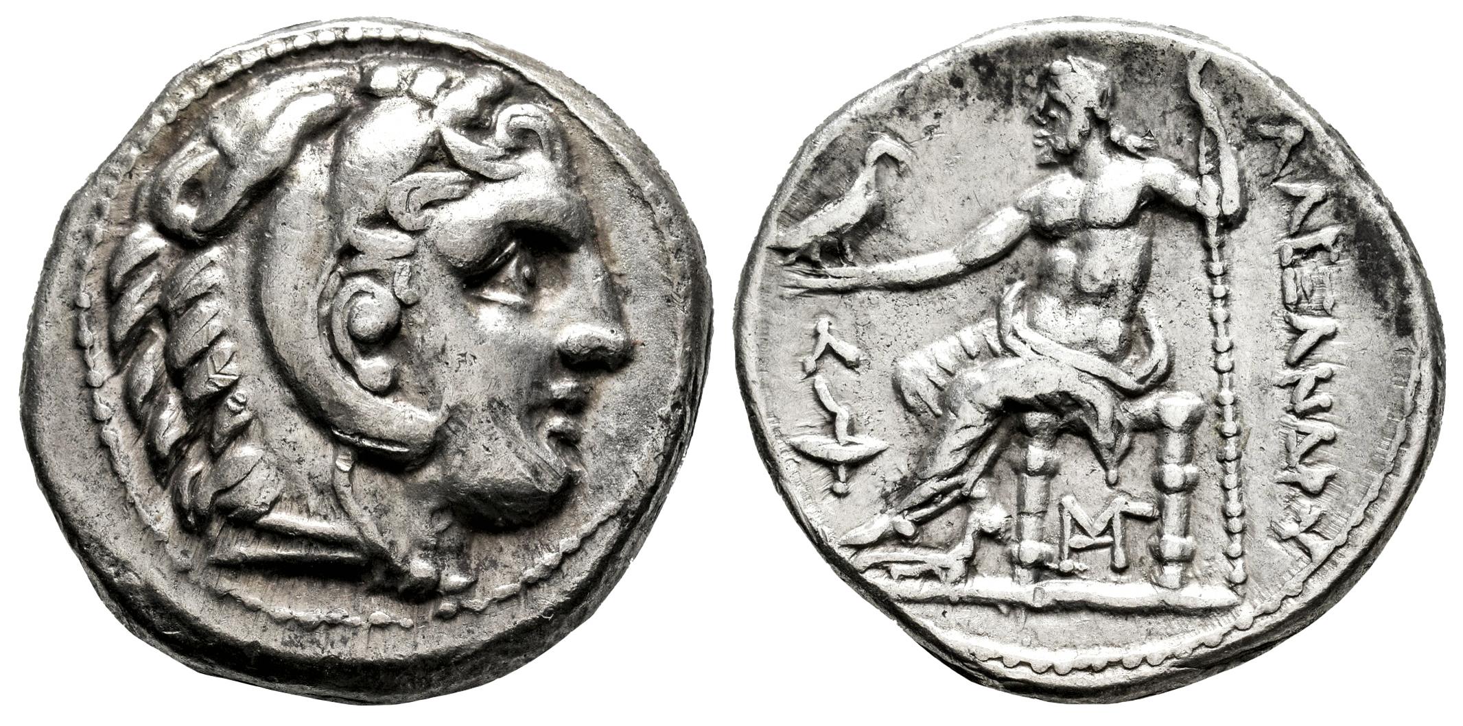 Reino de Macedonia. Kassander. Tetradracma. 315-294 a.C. Amphipolis. Acuñada como regente o Rey, en nombre y tipo de Alejandro III. (Price-447). (Müller-37). (Ehrhardt-35). Anv.:  Cabeza de Heracles a la derecha, con tocado de piel de león. Rev.: Zeus Aetophoros sedente a la izquierda, sosteniendo un cetro; AΛEΞANΔPOY a la derecha, Λ sobre una antorcha en el campo izquierdo, monograma bajo el trono. Ag. 17,12 g. MBC+. Est...300,00.