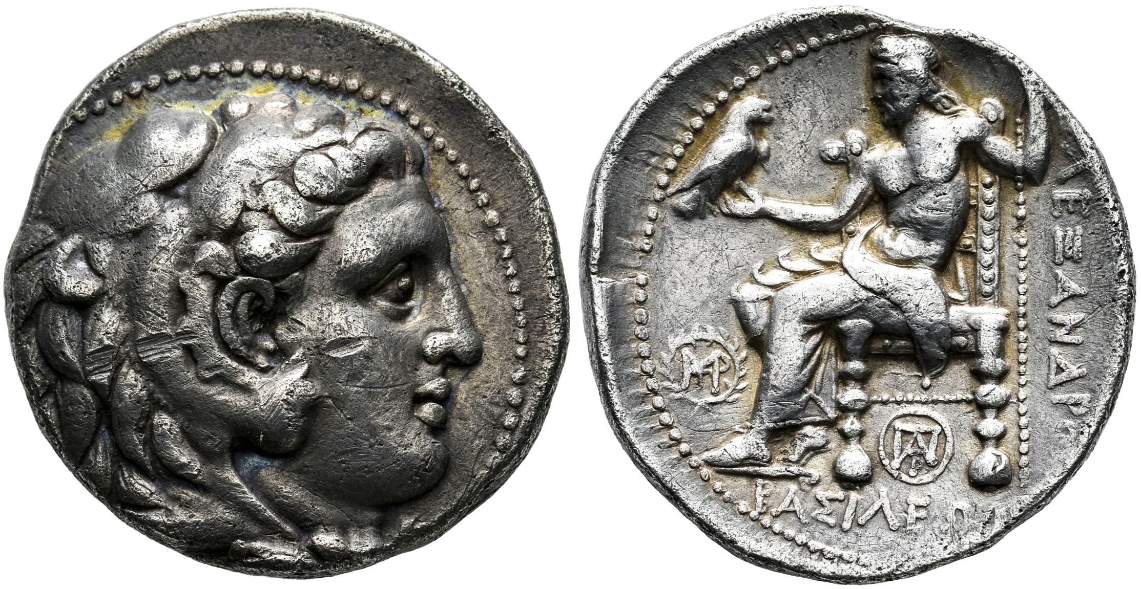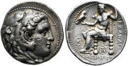 Reino de Macedonia. Alejandro III Magno. Tetradracma. 315-311 a.C. Babilonia. Acuñada por Peithon. (Price-3734 var.). Anv.: Cabeza de Heracles a la derecha, con tocado de piel de león. Rev.: ΒAΣIΛEΩΣ - AΛEΞANΔPOY. Zeus sedente a la izquierda sobre un trono bajo, con un cetro largo en la mano izquierda y un águila en pie a la derecha con las alas plegadas en la derecha; a la izquierda, monograma dentro de una corona; debajo del trono, monograma dentro de un círculo. Ag. 16,91 g. Golpecitos en anverso. Suave pátina con ligero tono. MBC. Est...400,00.