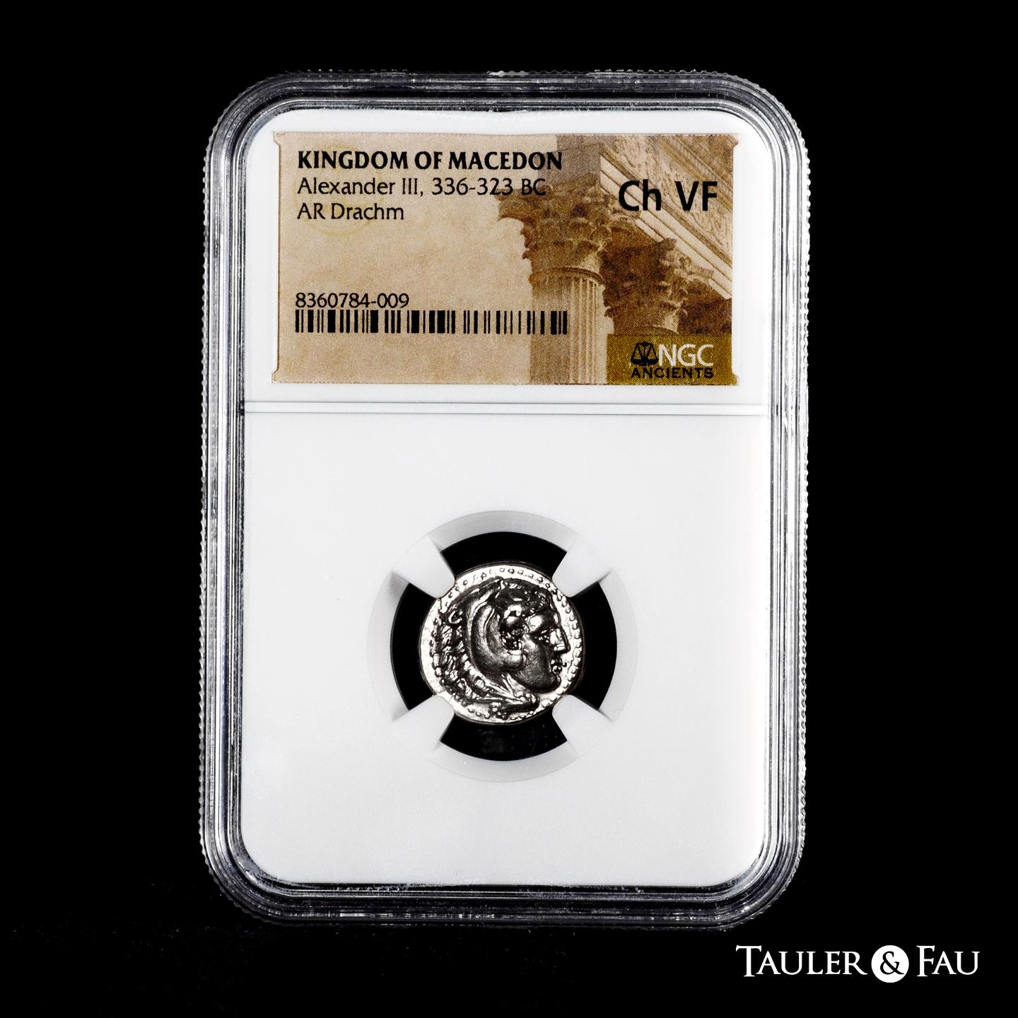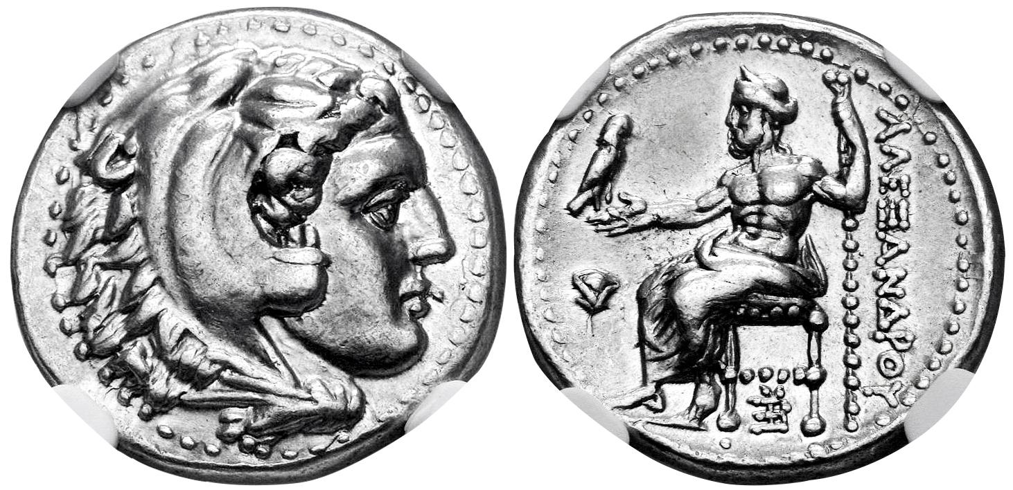 Reino de Macedonia. Alejandro III Magno. Dracma. 324/3 a.C. Sardes. Acuñado bajo Menander. (Price-2555). Anv.: Cabeza de Heracles a la derecha, con tocado de piel de león. Rev.: AΛEΞANΔPOY. Zeus sedente a la izquierda en un trono bajo, con un cetro largo en la mano izquierda y un águila en pie a la derecha con las alas plegadas en la derecha; en el campo izquierdo, una rosa; debajo del trono, monograma de ΞΥ debajo de la estructura. Ag. Muy bien centrada. Encapsulada por NGC como Ch VF. Est...250,00.