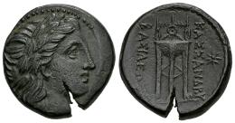 Reino de Macedonia. Kassander. AE 19. 305-298 a.C. Ceca incierta. (Sng München-1030 var.). (SNG Alpha bank-897 var.). Anv.: Cabeza laureada de Apolo derecha. Rev.: ΒΑΣΙΛΕΩΣ - ΚΑΣΣΑΝΔΡΟΥ. Trípode; estrella en el exterior derecho. Ae. 5,94 g. Flan algo abierto. Pátina negra. Ex Roma Numismatics (21/05/2013), Lote 361; Ex Colección Jörg Müller, Gorny & Mosch 97 (11/10/1999), lote 233. MBC+. Est...120,00.