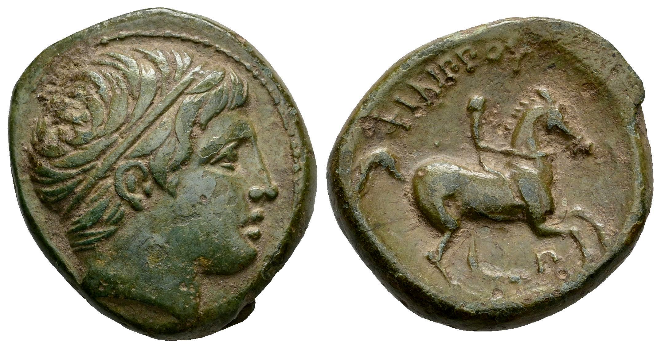 Reino de Macedonia. Filipo II. AE 18. 359-336 a.C. Ceca incierta en Macedonia. (Hgc-3.1, 882). (Sng Ans-944). Anv.: Cabeza diademada de Apolo a la derecha. Rev.: ΦΙΛΙΠΠΟΥ Joven a caballo a la derecha; abajo, Π. Ae. 5,66 g. Preciosa pátina verde. EBC-/MBC+. Est...90,00.