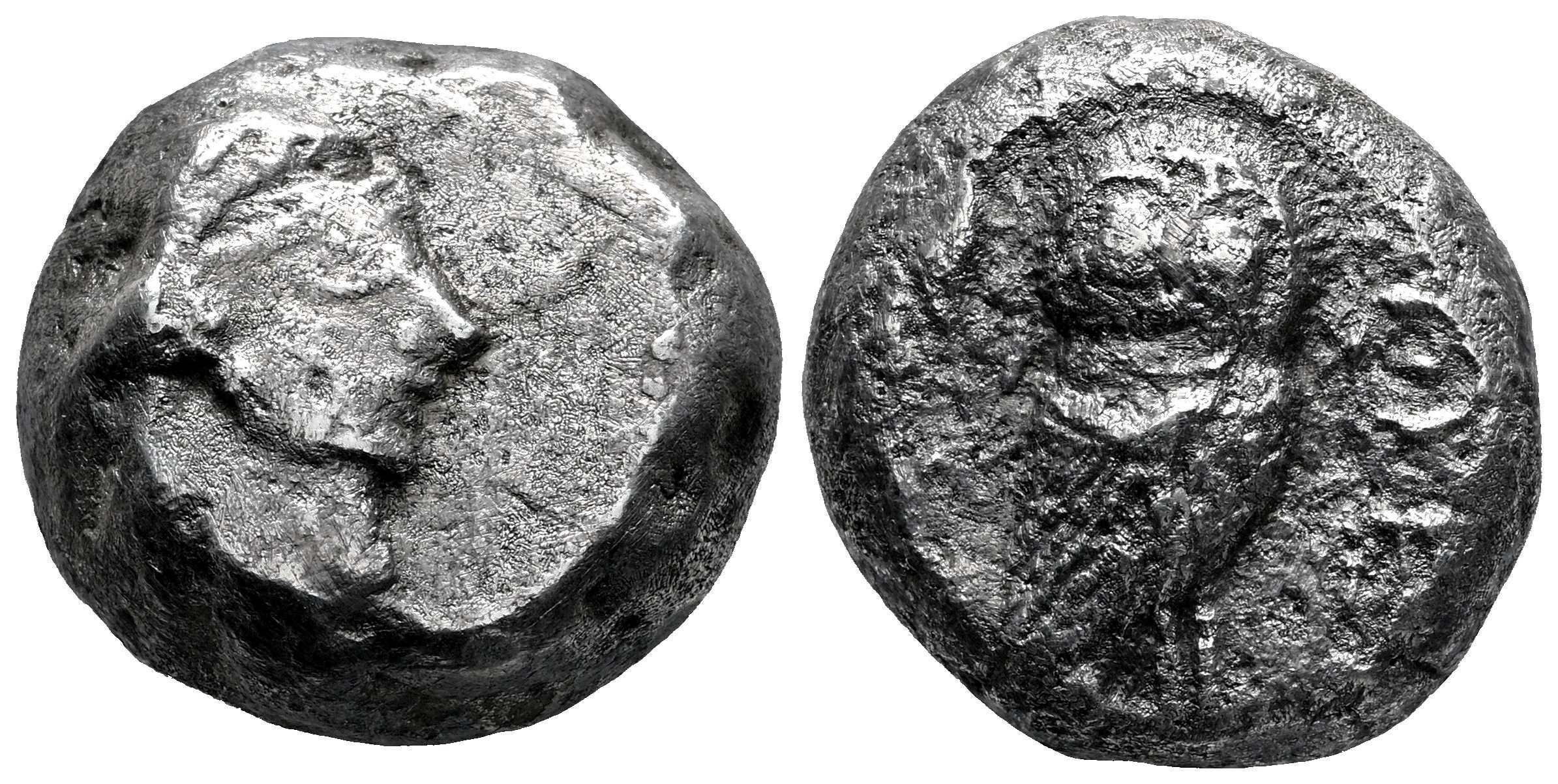 La calidad del grabado en los primeros tetradracmas «búho» varía enormemente, desde lo sublime hasta algunos de lo más tosco. Esta disparidad llevó a Seltman a proponer que aquellos tetradracmas de excelente estilo provenían de una ceca «cívica» de Atenas, mientras que aquellos, como la presente pieza, que demuestran escaso talento por parte de los grabadores, provenían de cecas de Ática, interior de Tracia, o de Paeonia, aunque esto ha sido posteriormente refutado