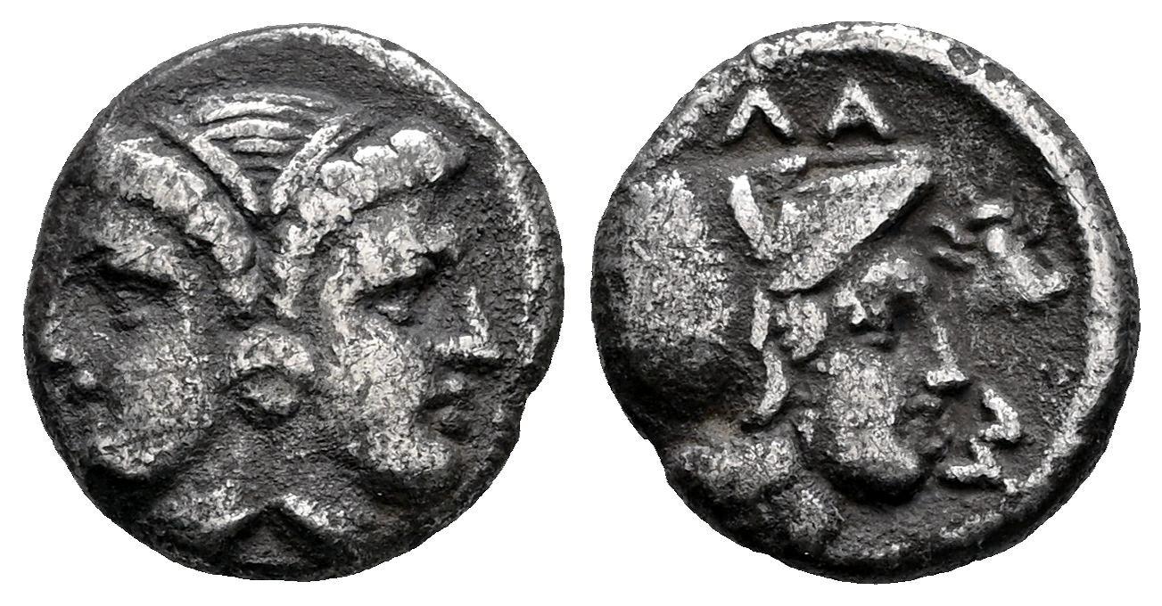 Mysia. Lampsakos. Dióbolo. 390-330 a.C. (SNG BnF-1190). (Sng Cop-192). Anv.: Cabeza femenina janiforme con pendientes. Rev.: Cabeza con casco de Atenea a la derecha; ΛΑΜ alrededor, abeja (o mosca) a la derecha. Ag. 1,02 g. MBC. Est...90,00.