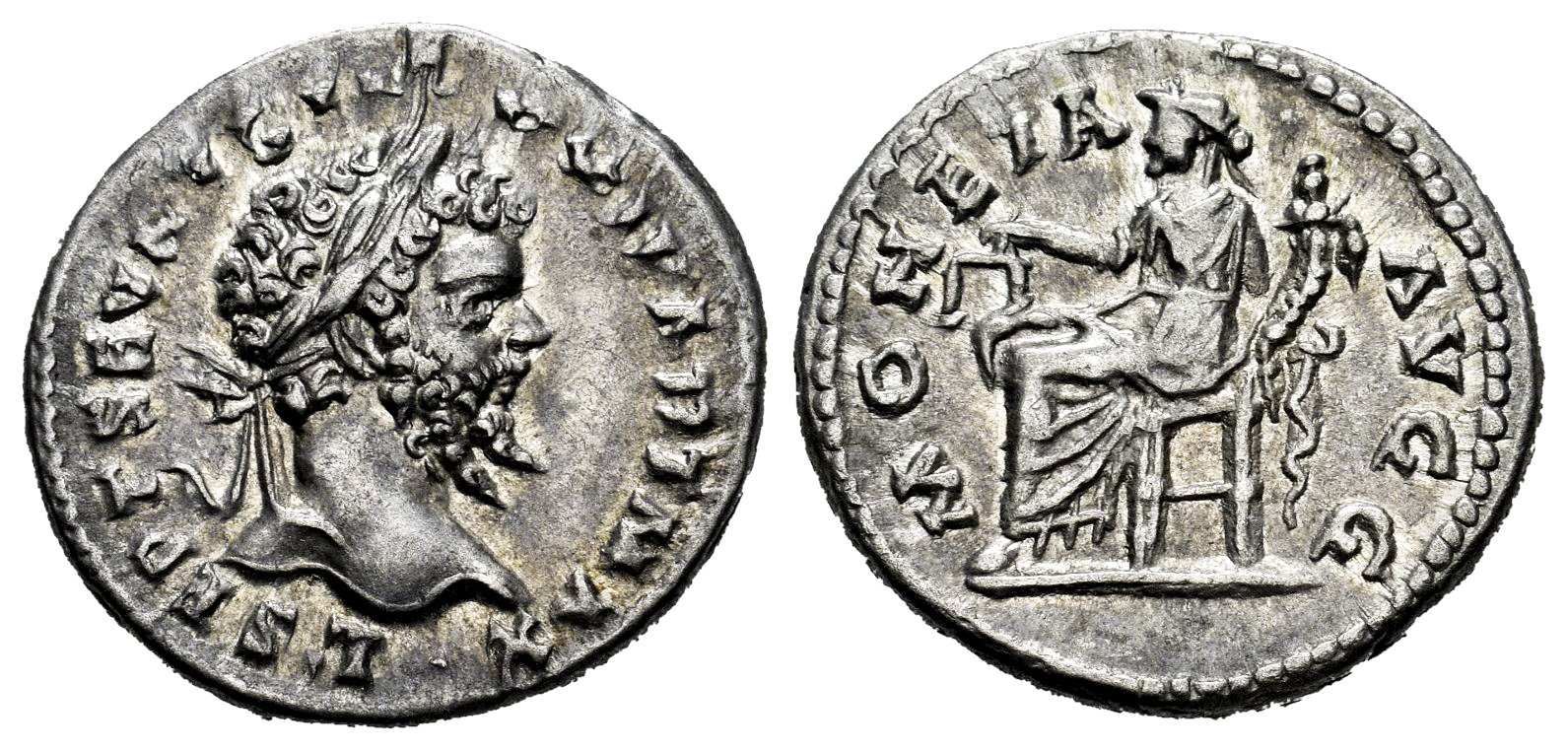 Septimio Severo. Denario. 198-202 d.C. Laodicea ad Mare. (Ric-IV 510a). (Bmcre-669). (Rsc-345). Anv.: L SEPT SEV AVG IMP XI PARTE MAX. Cabeza laureada a la derecha. Rev.: MONETA AVGG. Moneta sedente a la izquierda, sosteniendo balanzas y cornucopias. Ag. 3,35 g. Bonito tono. Restos de brillo original. Ex Naville Numismatics 30 (02/04/2017), lote 584. Conserva la etiqueta original. EBC. Est...150,00.