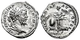 Septimio Severo. Denario. 198-202 d.C. Laodicea ad Mare. (Ric-IV 516). (Bmcre-678). (Rsc-719). Anv.: L SEPT SEV AVG IMP XI PART MAX. Cabeza laureada a la derecha. Rev.: VICTORIAE AVGG FEL. Victoria avanzando hacia la izquierda, sosteniendo una corona abierta con ambas manos sobre un escudo colocado sobre una base baja. Ag. 2,97 g. Restos de brillo original. Atractiva. EBC. Est...120,00.