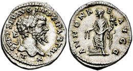Septimio Severo. Denario. 198-202 d.C. Laodicea ad Mare. (Ric-IV 501). (Bmcre-652). (Rsc-39). Anv.: L SEPT SEV AVG IMP XI PARTE MAX. Cabeza laureada a la derecha. Rev.: ANNONAE AVGG. Annona en pie a la izquierda, pie sobre una proa, sosteniendo espigas y cornucopia. Ag. 3,46 g. Bonito ejemplar. Ligero tono. Ex Fritz Rudolf Künker 61 (11/08/2020), lote 126. EBC. Est...120,00.