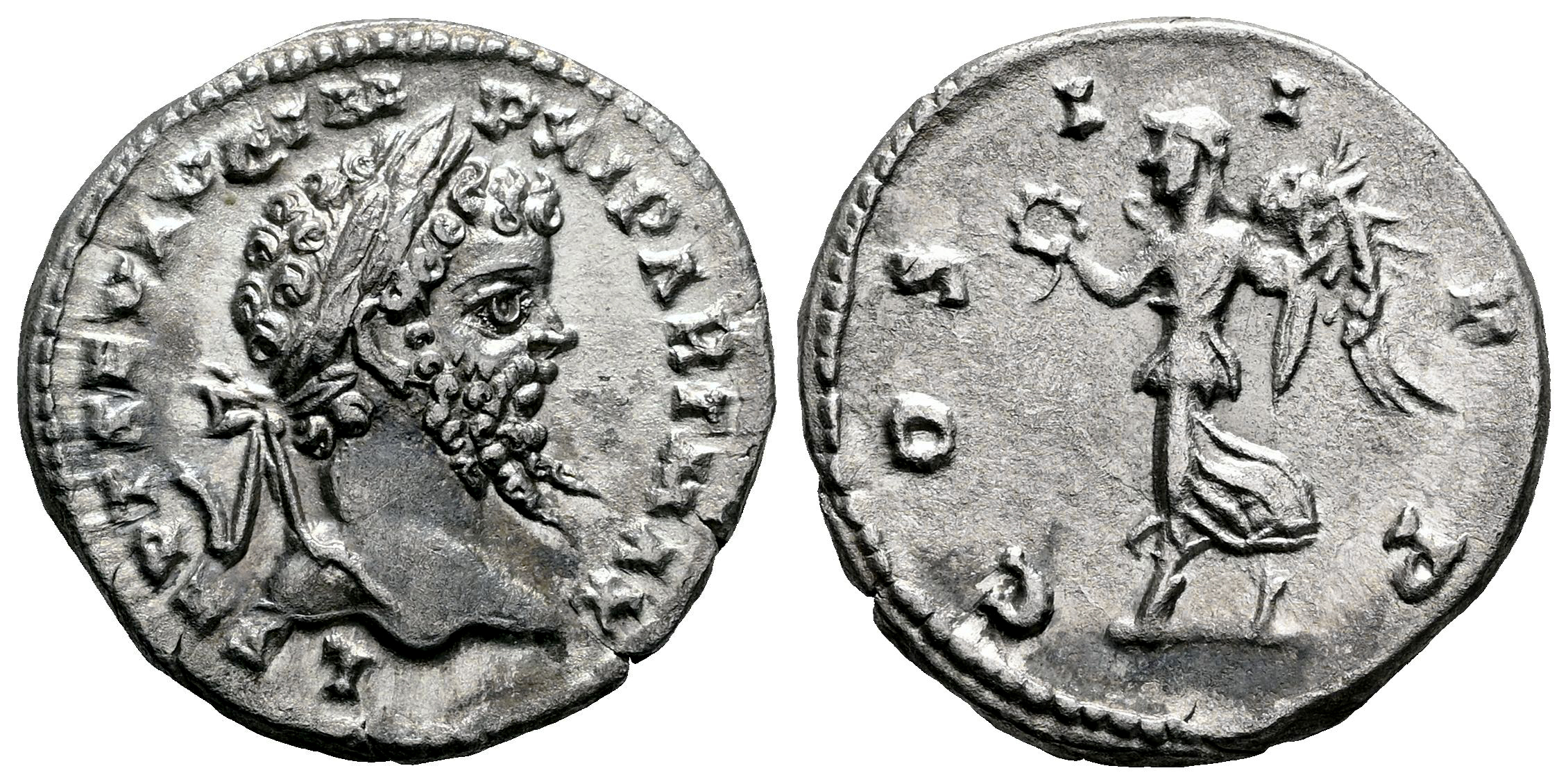 Septimio Severo. Denario. 198-202 d.C. Laodicea. (Ric-IV 503a). (Bmcre-655). (Rsc-96). Anv.: L SEPT SEV AVG IMP XI PART MAX. Cabeza laureada a la derecha. Rev.: COS II P P. Victoria avanzando hacia la izquierda, sosteniendo corona y palma. Ag. 3,26 g. Ex Soler&Llach (14/05/2009), lote 2731. EBC-/MBC+. Est...80,00.