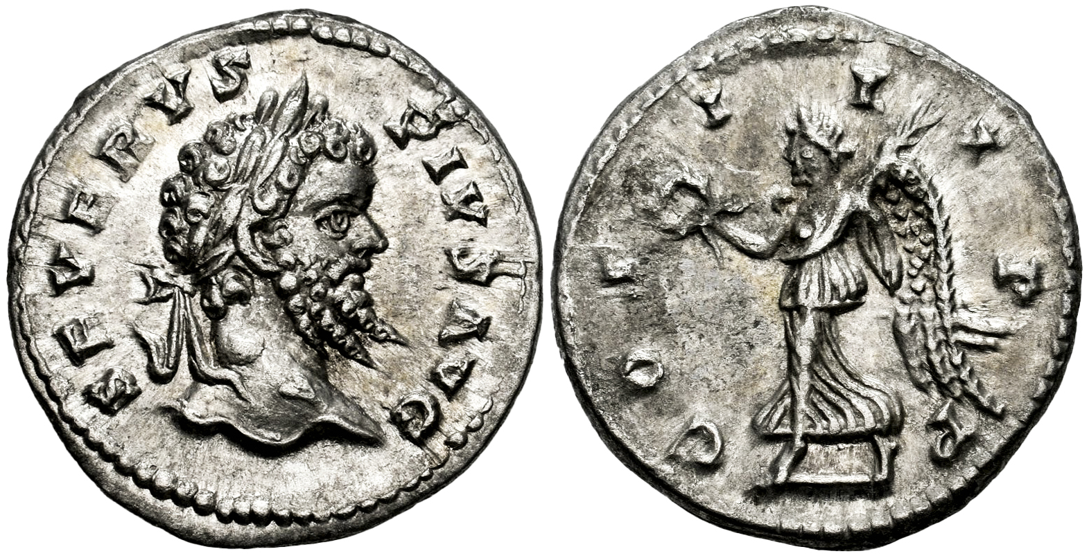 Septimio Severo. Denario. 198-202 d.C. Laodicea ad Mare. (Eic-503a). (Bmcre-655). (C-96 corr.). Anv.: SEVERVS PIVS AVG. Cabeza laureada a la derecha. Rev.: COS II P P. Victoria avanzando hacia la izquierda, sosteniendo una corona en la mano derecha y la palma sobre el hombro izquierdo. Ag. 3,24 g. Acuñación muy bien centrada. Brillo original. Ex Leu Numismatik 10 (7-8/12/2019), lote 1202. Conserva la etiqueta original. EBC+/EBC. Est...150,00.