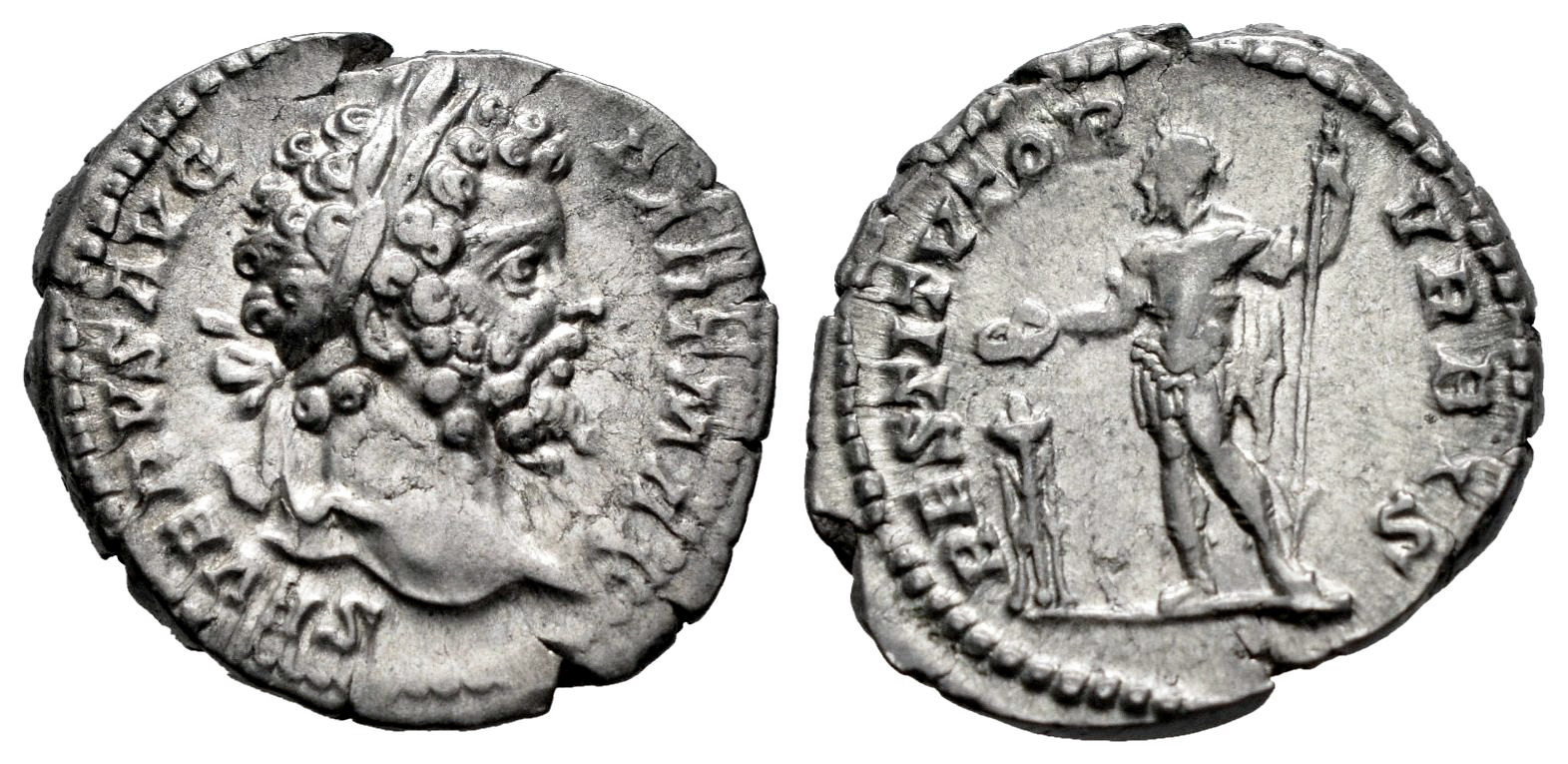 Septimio Severo. Denario. 200-201 d.C. Roma. (Ric-168a). (C-612). Anv.: SEVERVS AVG PART MAX. Cabeza laureada a la derecha. Rev.: RESTITVTOR VRBIS. Septimio Severo, con atuendo militar, en pie de frente, mirando a la izquierda, sacrificando con una pátera sobre un trípode iluminado con la mano derecha y sosteniendo una lanza invertida con la izquierda. Ag. 3,44 g. Ex Leu Numismatik 26 (08/07/2023), lote 4553. MBC+. Est...100,00.