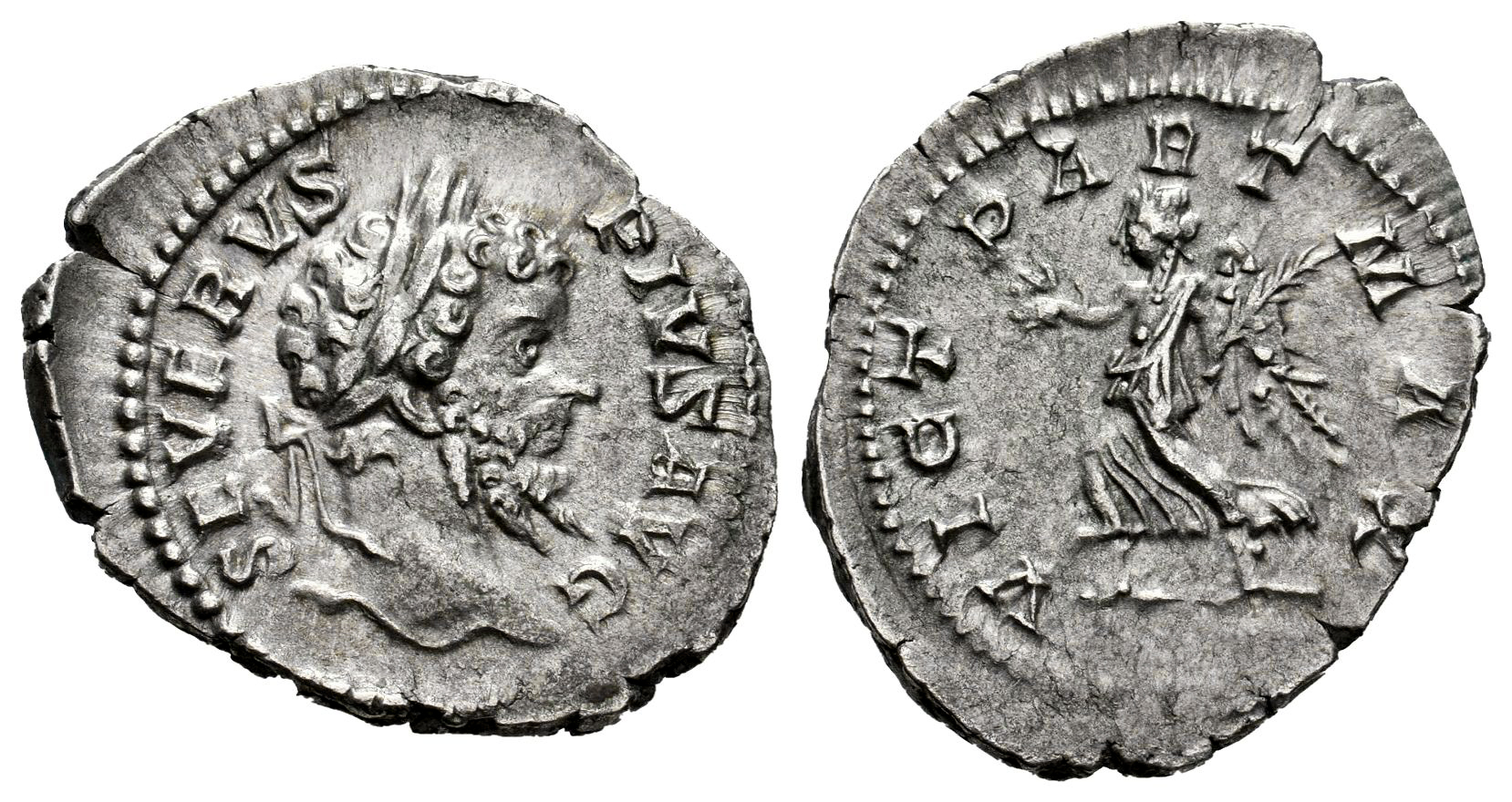 Septimio Severo. Denario. 202-210 d.C. Roma. (Ric-IV 295). (Bmcre-365). (Rsc-744). Anv.: SEVERVS PIVS AVG. Cabeza laureada a la derecha. Rev.: VICT PART MAX. Victoria avanzando hacia la izquierda, sosteniendo corona y rama de palma. Ag. 2,86 g. EBC-. Est...100,00.