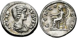 Julia Domna. Denario. 196-202 d.C. Laodicea ad Mare. (Ric-IV 637). (Bmcre-593). (Rsc-21). Anv.: IVLIA AVGVSTA. Busto drapeado a la derecha. Rev.: CONCORDIA,.Concordia sedente a la izquierda, sosteniendo pátera y cornucopias doble. Ag. 4,51 g. Ligero tono. Ex Áureo&Calicó 352 (20/10/2020), lote 2126. EBC/EBC-. Est...180,00.