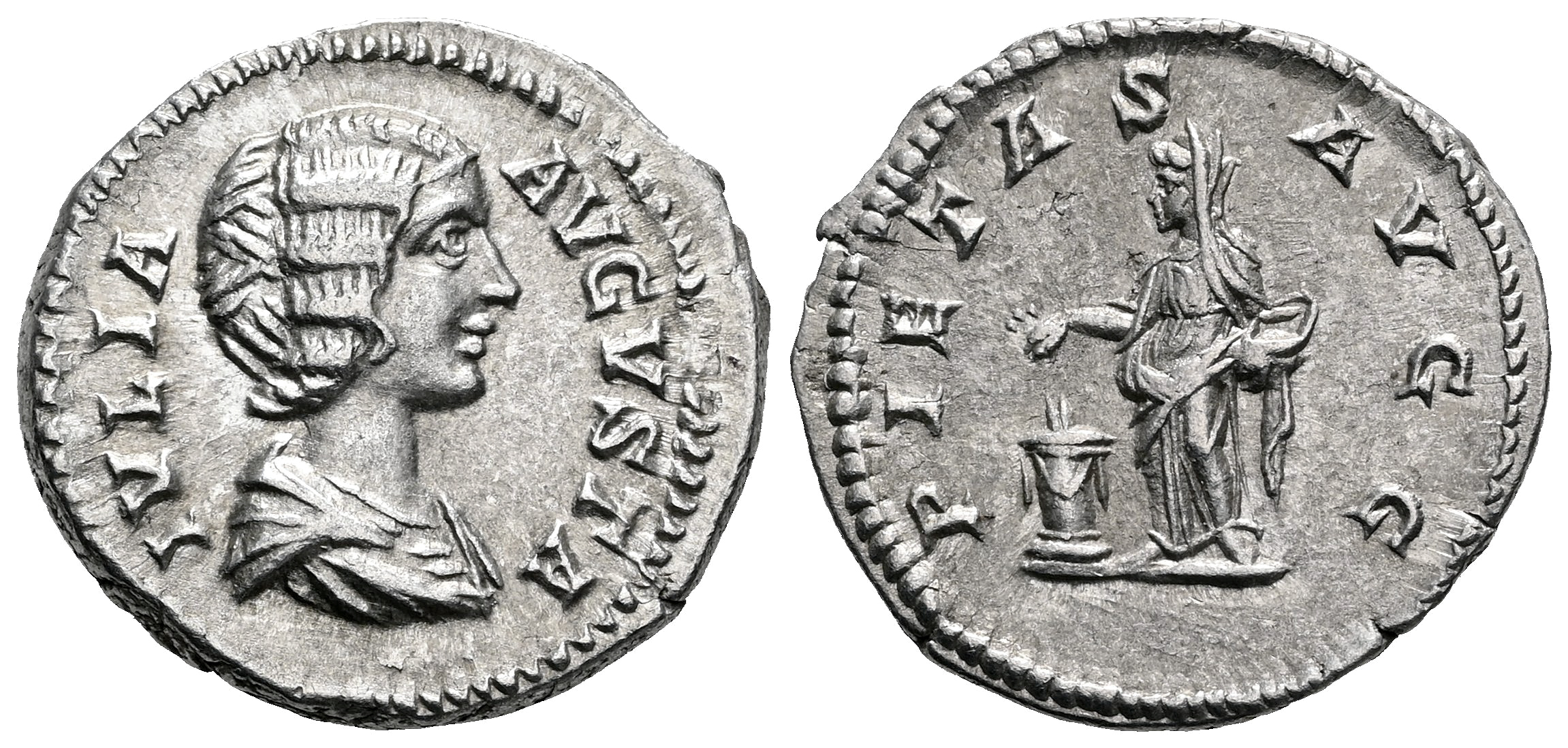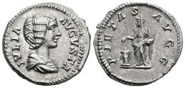 Julia Domna. Denario. 196-221 d.C. Roma. (Ric-IV 572). (Bmcre-62). (Rsc-150). Anv.: IVLIA AVGVSTA. Busto drapeado a la derecha. Rev.: PIETAS AVGG. Pietas en pie de frente, sosteniendo una caja de incienso y rociando incienso sobre un altar en llamas y enguirnaldado a la izquierda. Ag. 3,34 g. Bonito ejemplar. EBC. Est...120,00.
